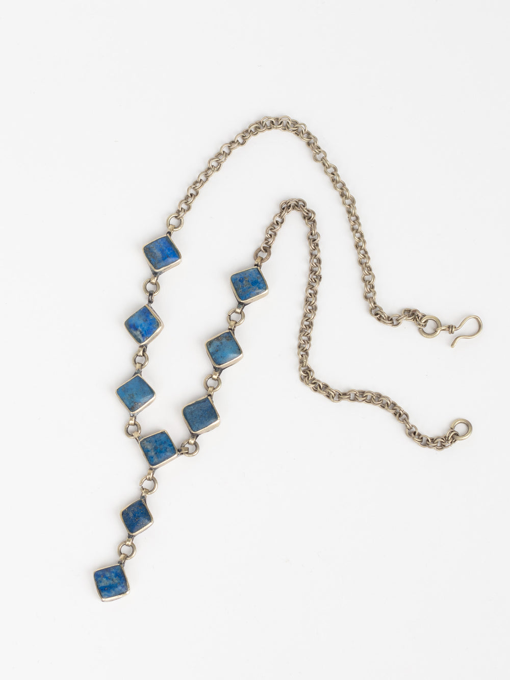 This vintage necklace from the 1970s features a striking Y-shaped design with nine diamond-shaped lapis blue stones set in silver-tone metal. The pendant section drops down in a tiered geometric formation, adding a unique artisan flair.