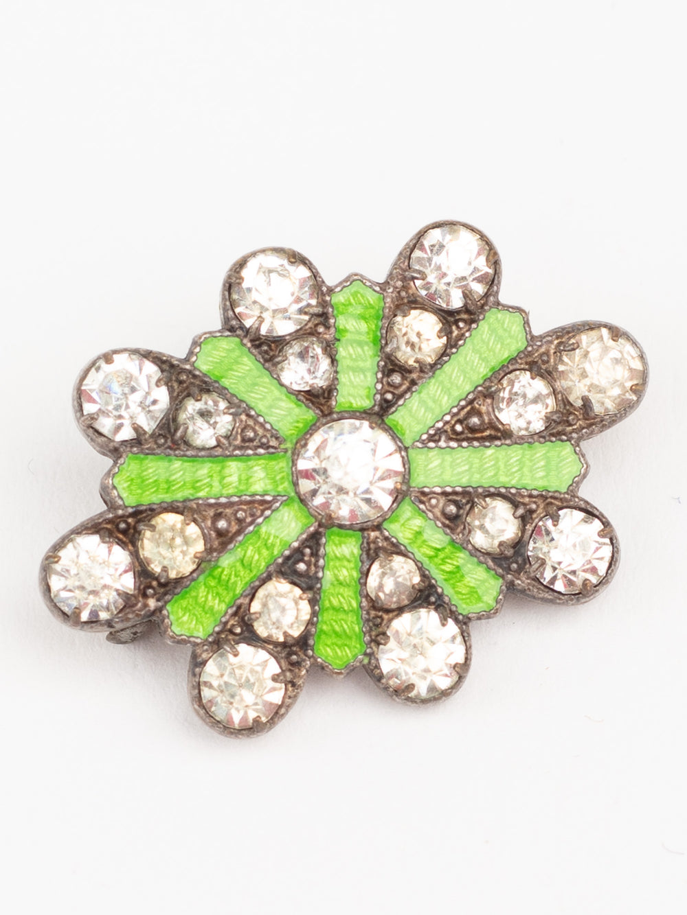 This Art Deco brooch from the 1930s features a vibrant green enamel starburst design with clear rhinestones set in a silver-tone floral shape. Compact and full of character, this piece channels the bright geometric glamour of the era, making it perfect for vintage lovers or collectors of Deco accessories.