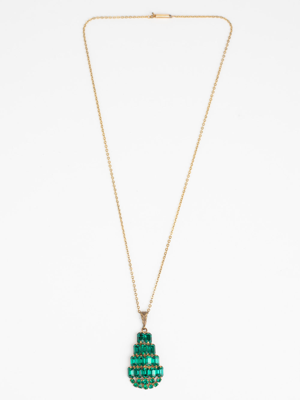 This eye-catching vintage pendant features vibrant emerald-green baguette and round rhinestones in a cascading tiered design. Set in warm gold-tone metal with a sturdy vintage chain and barrel clasp, the piece is signed "RG" on the back.