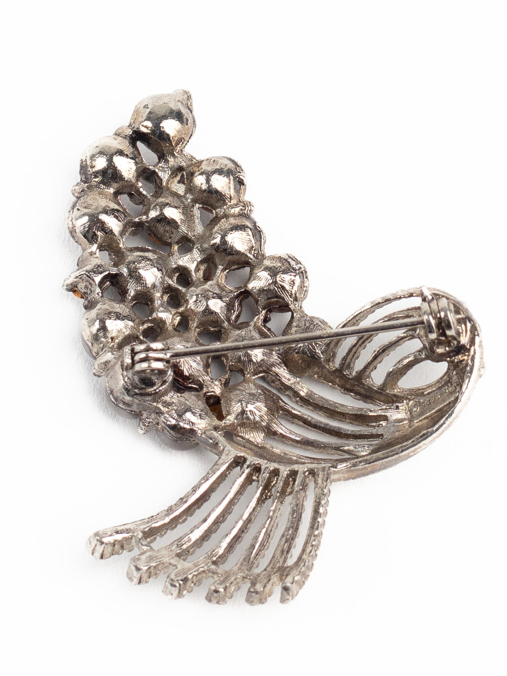 A charming midcentury brooch shaped like a bow with faux pearl, black, and clear rhinestone detailing. The textured silver-tone setting adds graceful movement, perfect for a classic touch on coats or blouses.