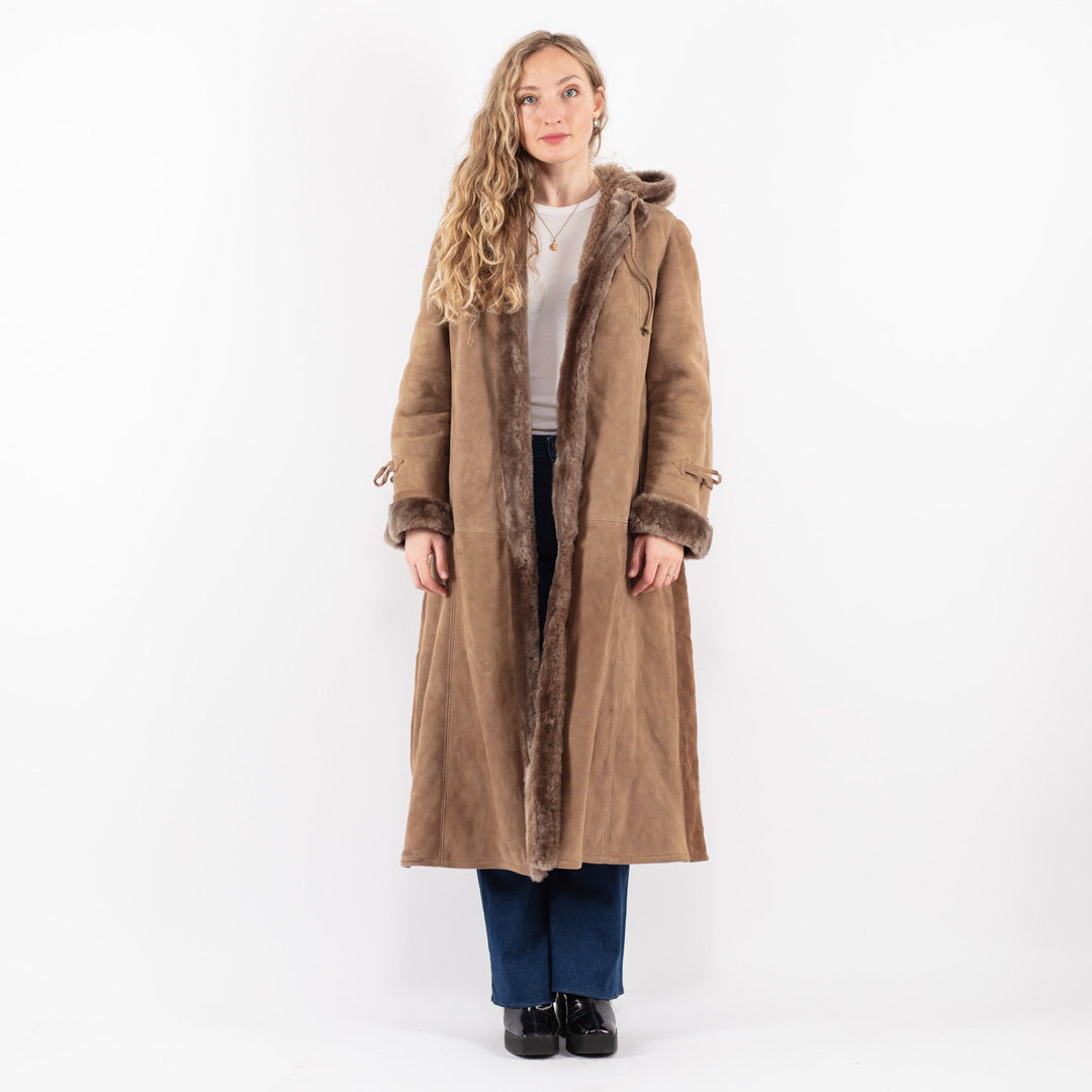 Beige Vintage 70's Women Hooded Sheepskin Long Coat in Beige With Free Delivery