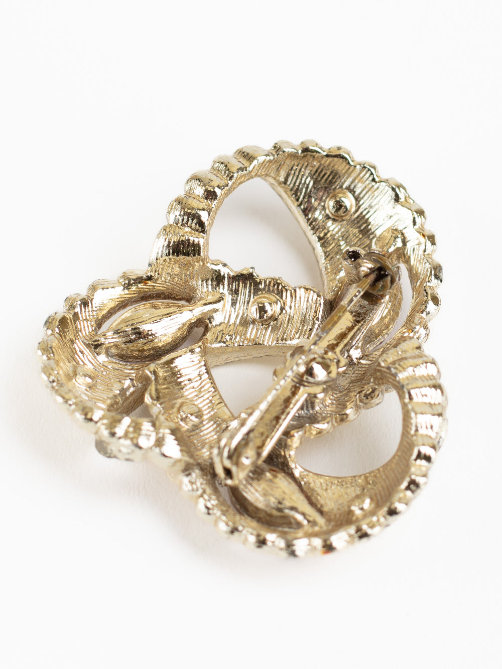 A charming 1980s vintage brooch featuring a gold-tone leaf swirl design set with sparkling brown rhinestones. Perfect for a retro look.