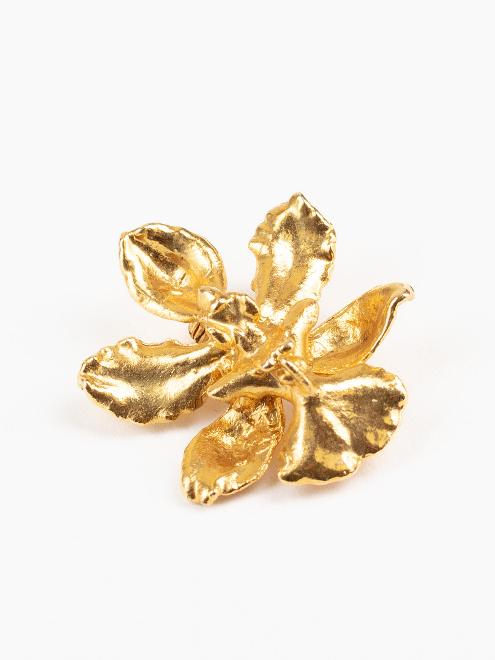 This striking vintage brooch features a bold sculptural flower design in shiny gold-tone metal with textured petals and organic detailing. The flowing, irregular shape gives it a unique look, perfect for adding a statement to jackets, dresses, or bags.