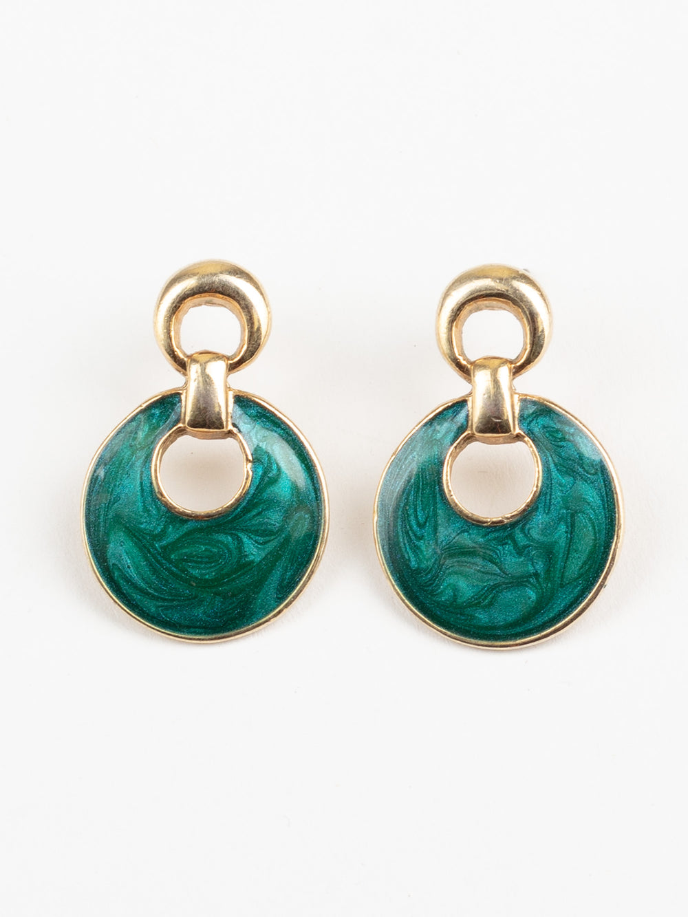 Chic vintage dangle earrings featuring a circular drop design with deep green marbled enamel inlay. The gold-tone textured backs and modernist shape give these earrings a bold retro style, perfect for lovers of 1980s fashion.