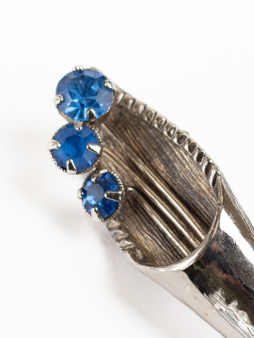Eye-catching vintage brooch by Jonette Jewelry (JJ) featuring a silver-tone leaf with three brilliant blue rhinestones. Elegant botanical design adds a bold vintage touch to any outfit.