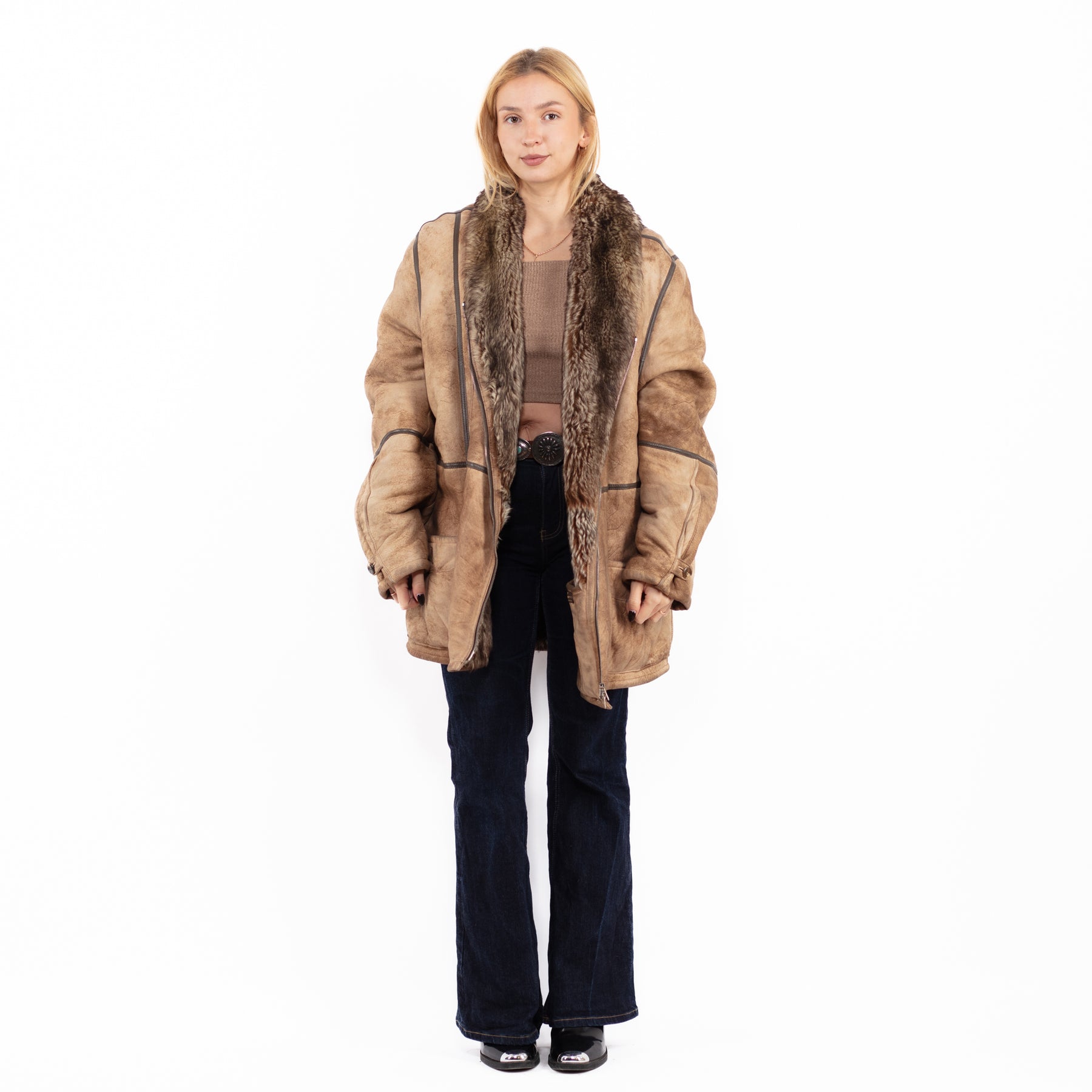 Vintage 80's Penny Lane Sheepskin Coat in Beige Brown