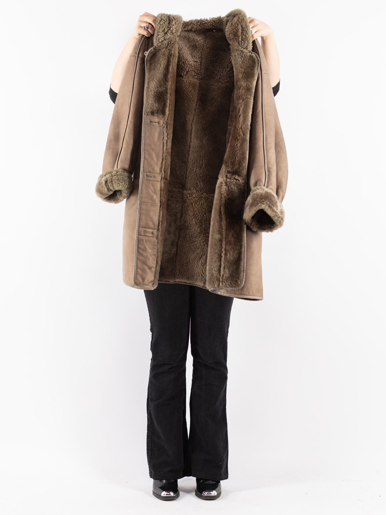 Vintage 80's Women Hooded Sheepskin Coat in Beige