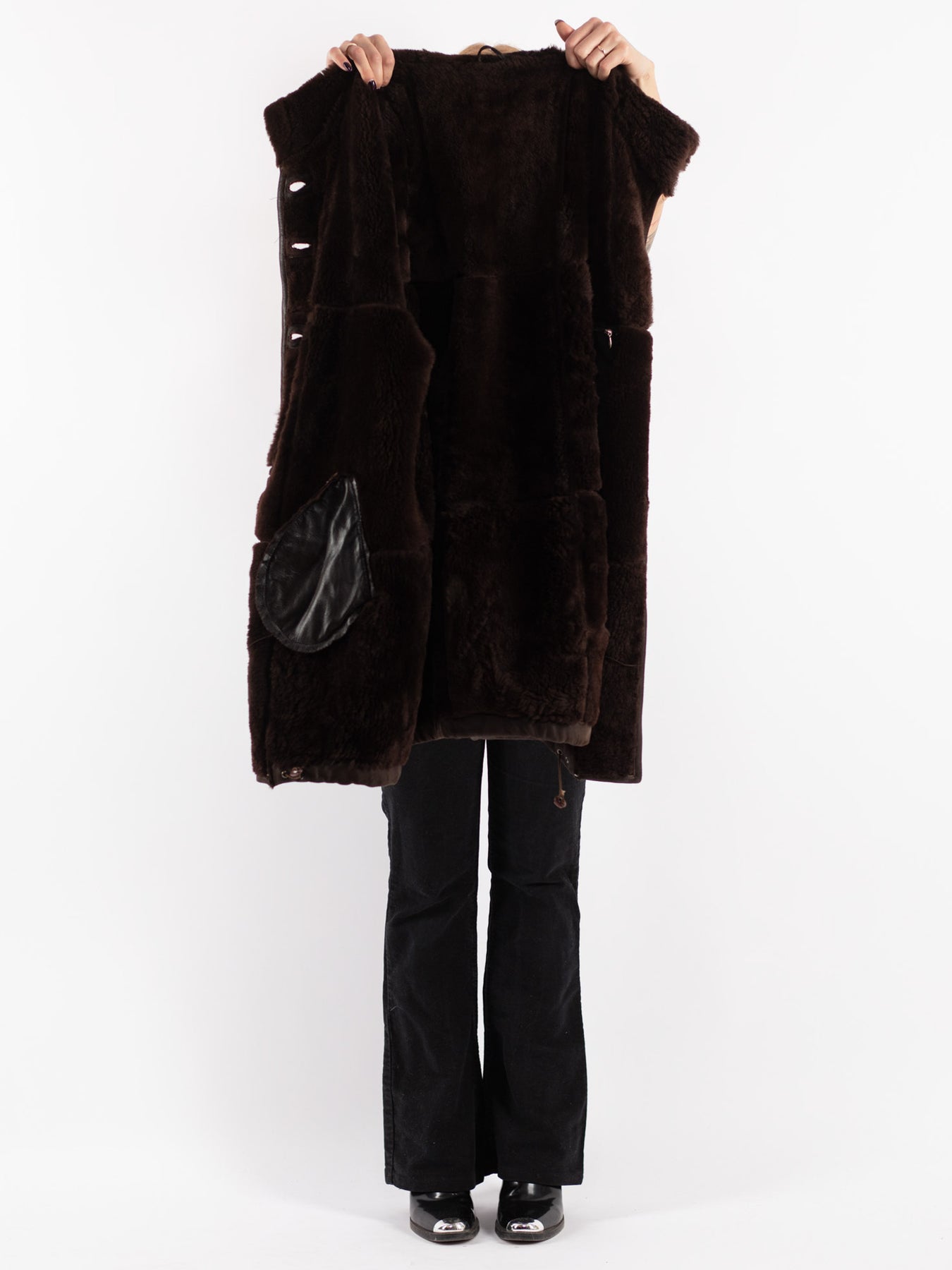 Vintage 80's Women Hooded Sheepskin Coat in Brown