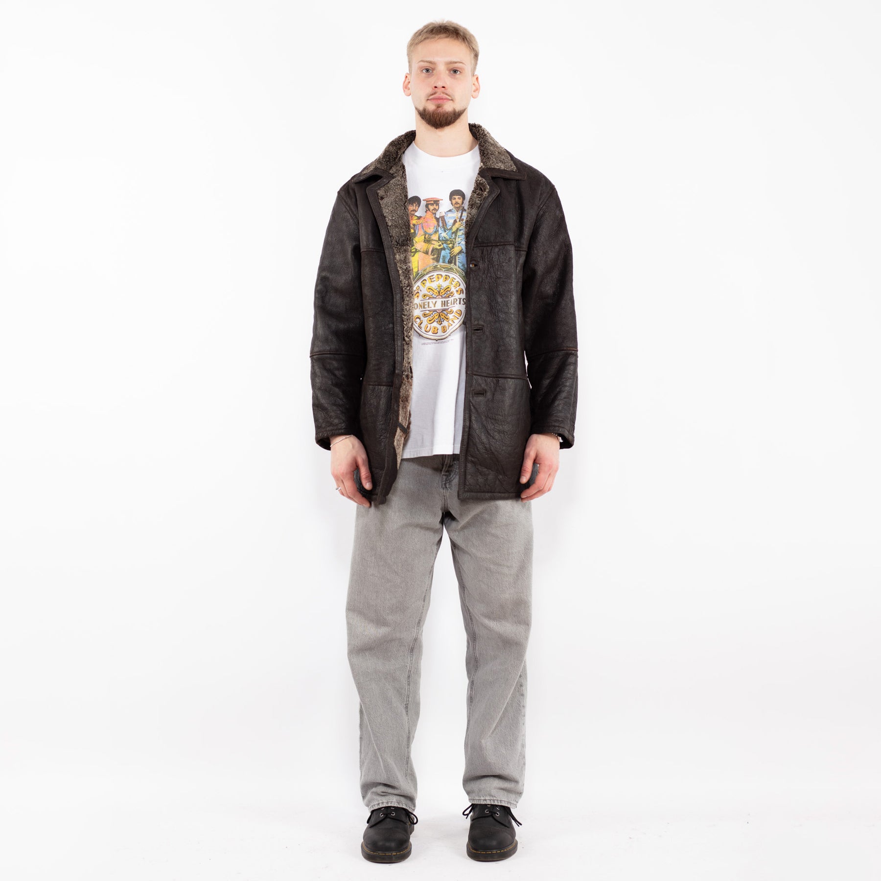 What it is: Vintage 90's Men Sheepskin Coat in Brown — genuine sheepskin (shearling), one-of-a-kind vintage.