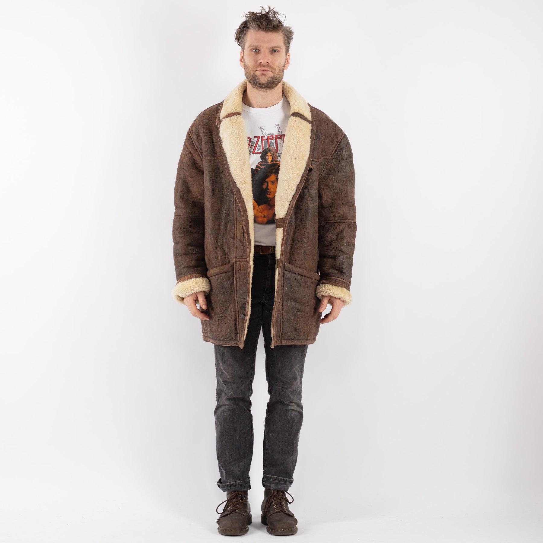 Vintage 90's Men Oversized Sheepskin Coat in Brown
