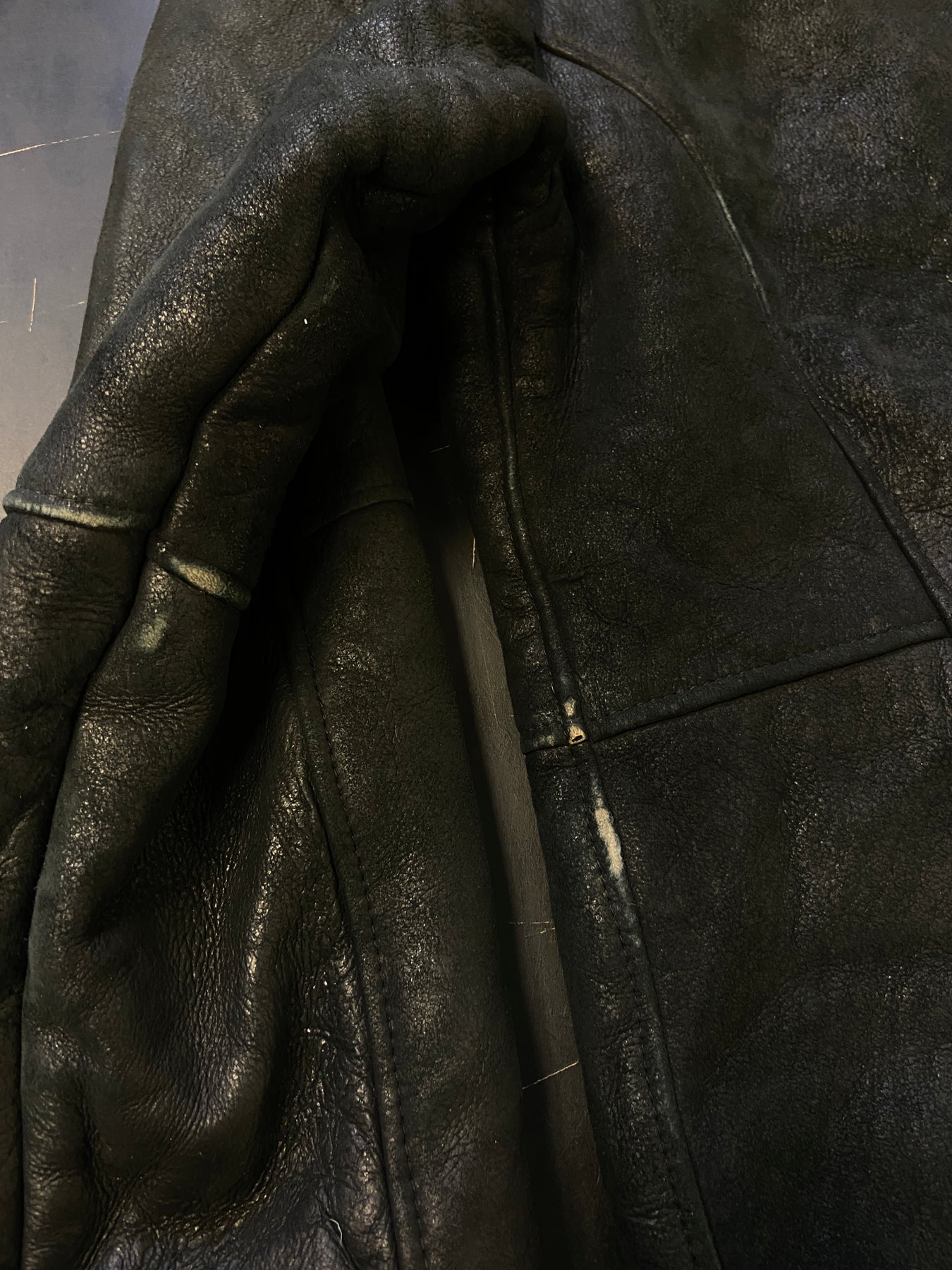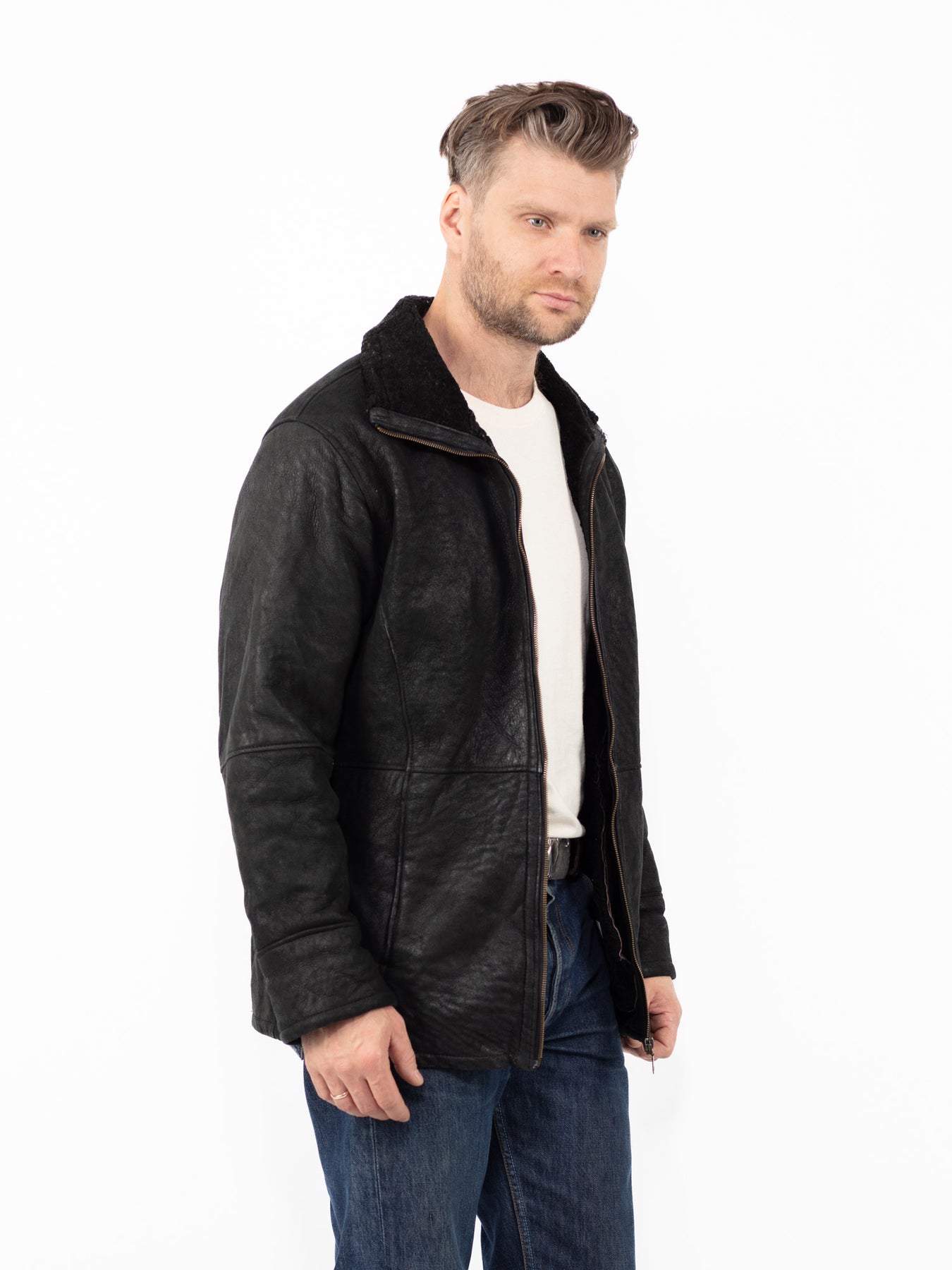 What it is: Vintage 90's Men Sheepskin Jacket in Black — genuine sheepskin (shearling), one-of-a-kind vintage.