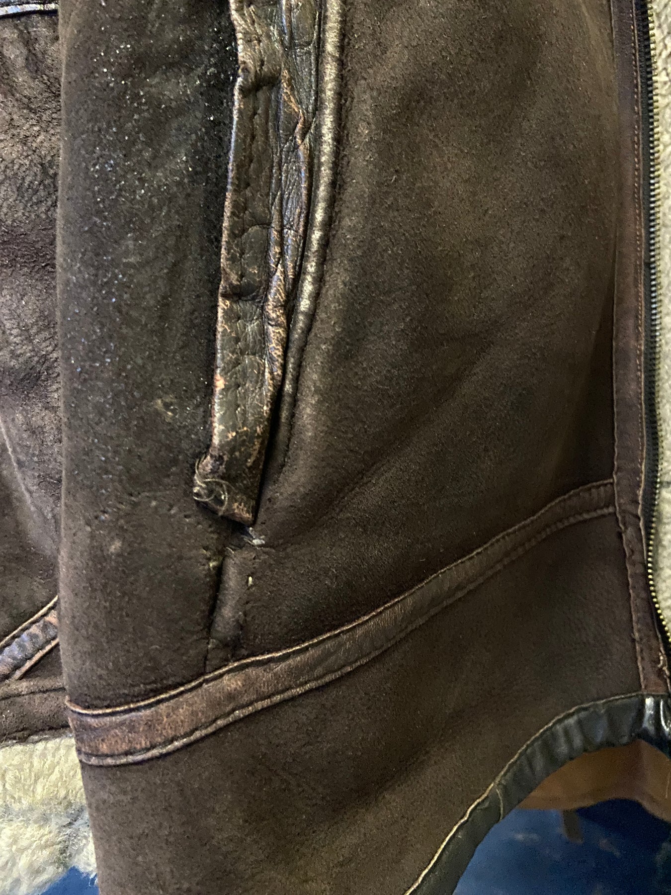 Vintage condition evaluation: 6/10 Shows signs of age and vintage wear, natural fading and surface bruising along the edges, sleeves, and seam lines. The shearling wool has noticeably flattened around the neckline and lower side seams and there is a mended spot on the right-hand pocket corner that shows hand stitching (see last photo)