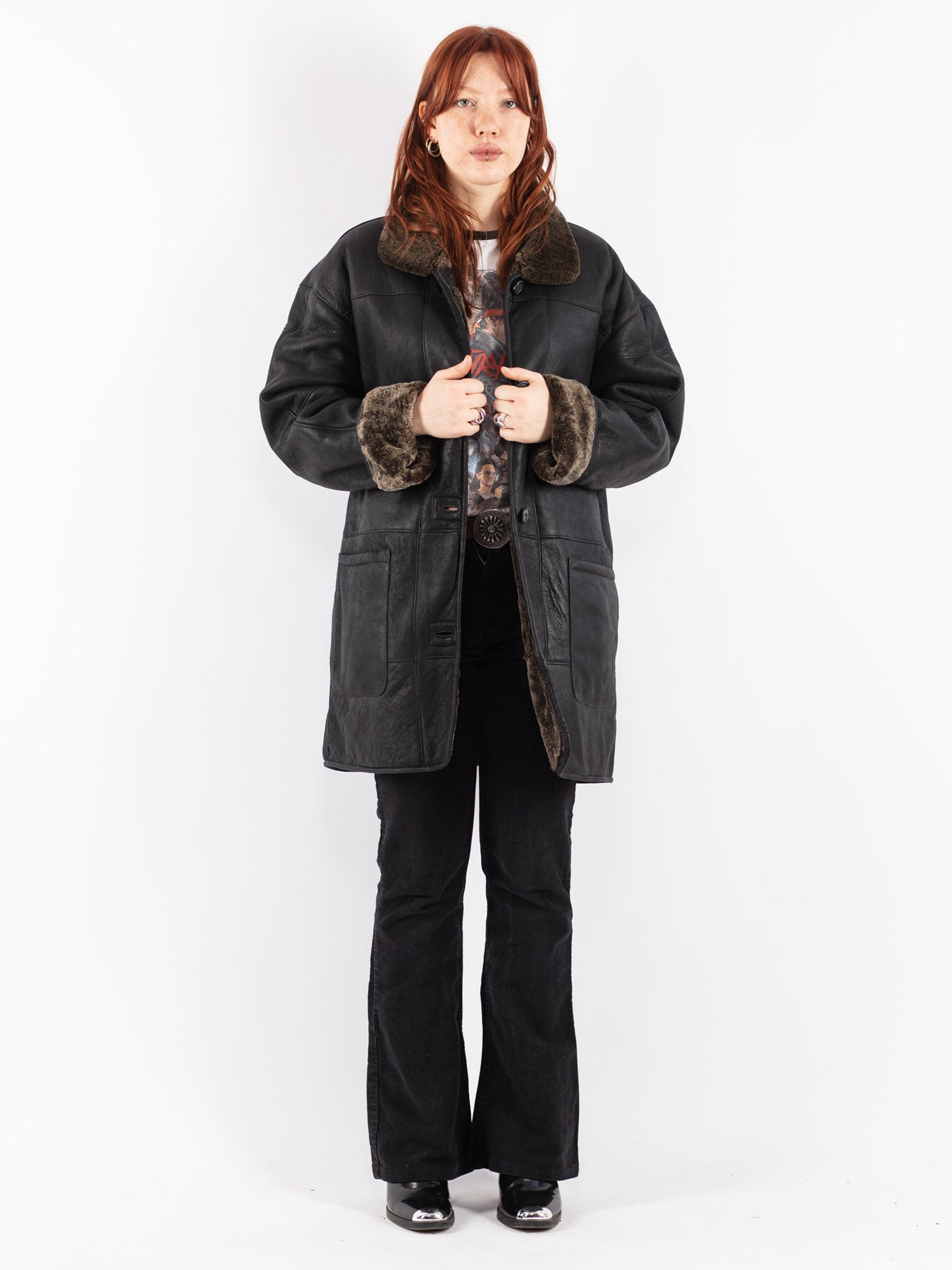 Black Vintage 90's Women Oversized Sheepskin Coat in Black With Free Delivery