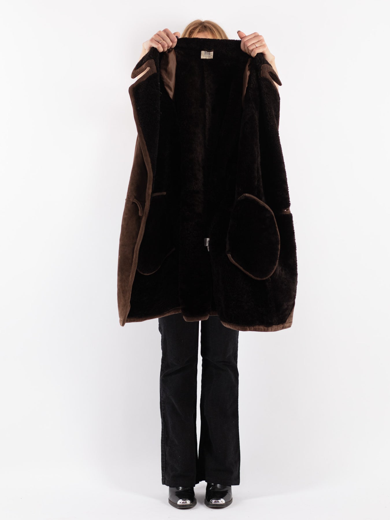 Vintage 90's Women Oversized Sheepskin Coat in Brown