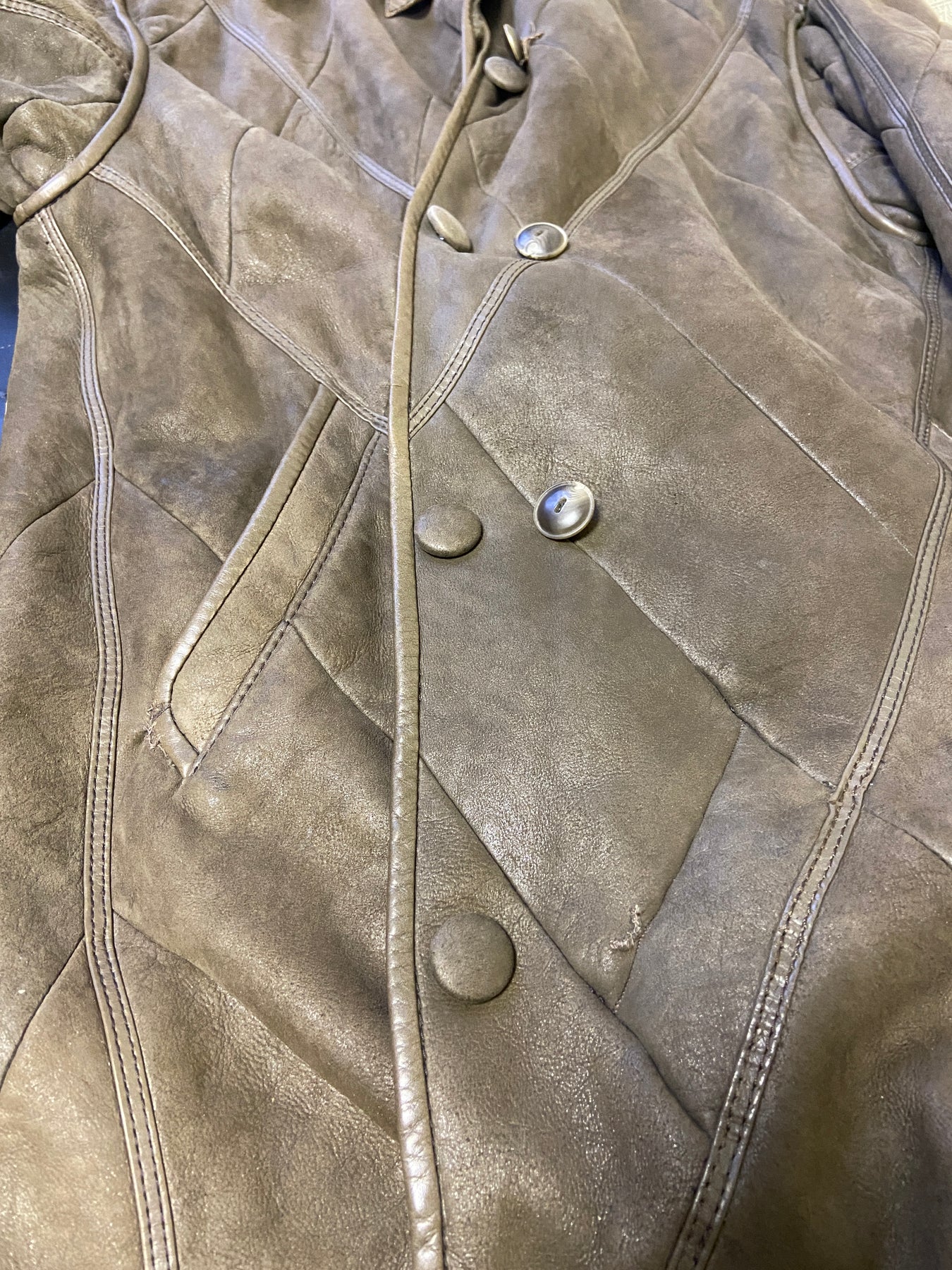Vintage condition evaluation: 6.5/10 Shows some overall wear and surface bruising around the edges; mended spots near the lower button and pocket corner show hand stitching; button position has been changed slightly, leaving tiny holes in their original place