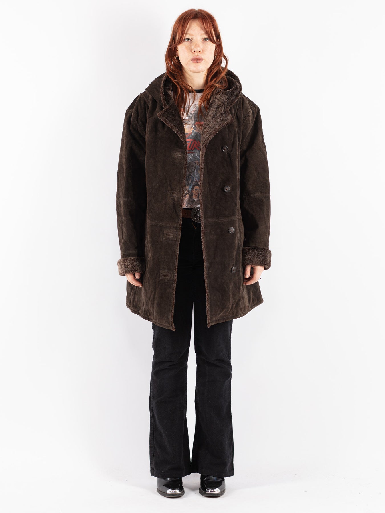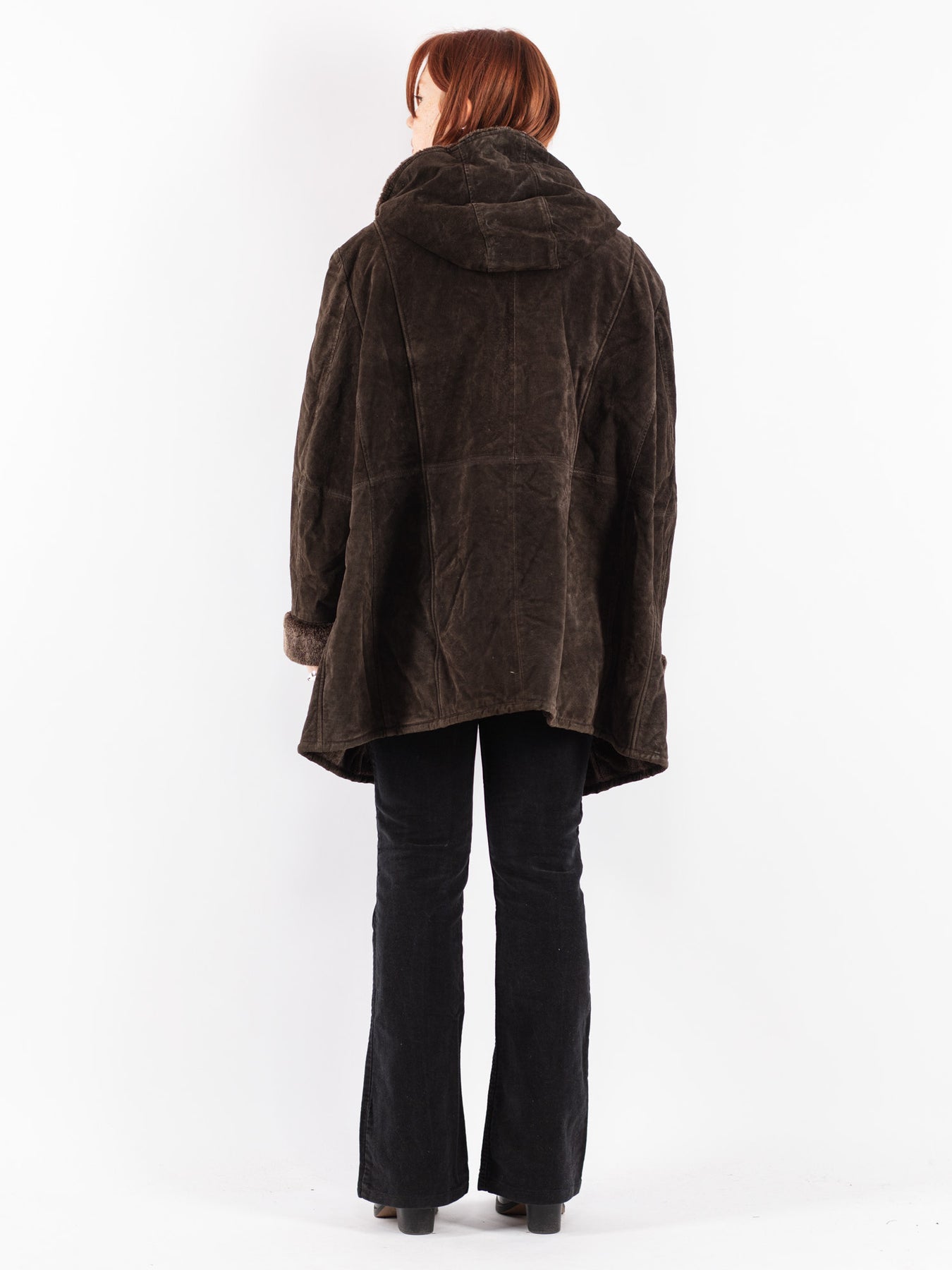 Vintage 90's Women Hooded Suede Sherpa Coat in Brown