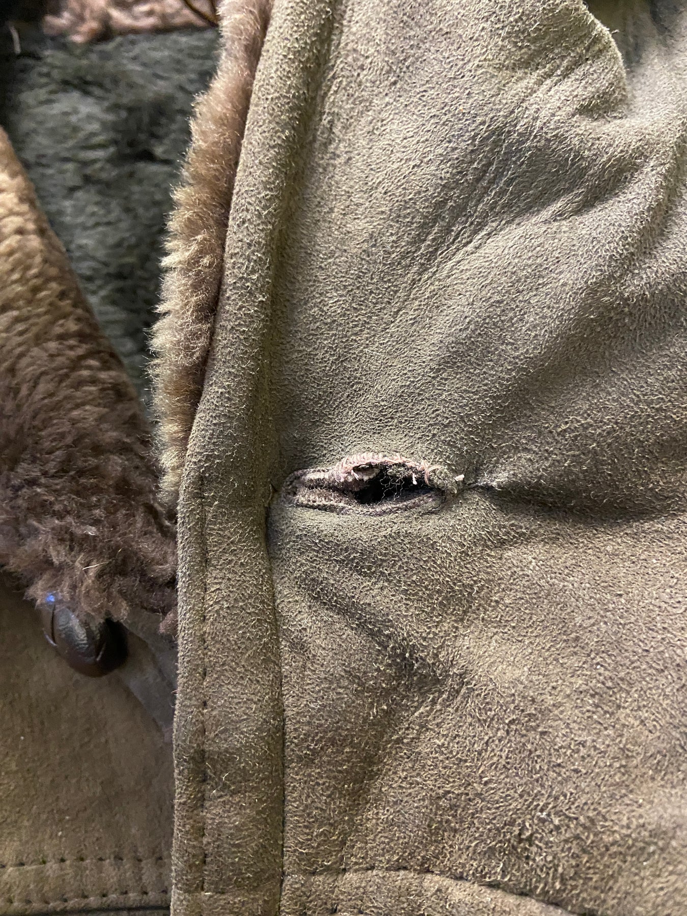 Vintage condition level: 7/10 Showing wear and overall bruising with some fading and discoloration around the edges; the upper button hole had been torn but it has been mended as seen in the attached photo.