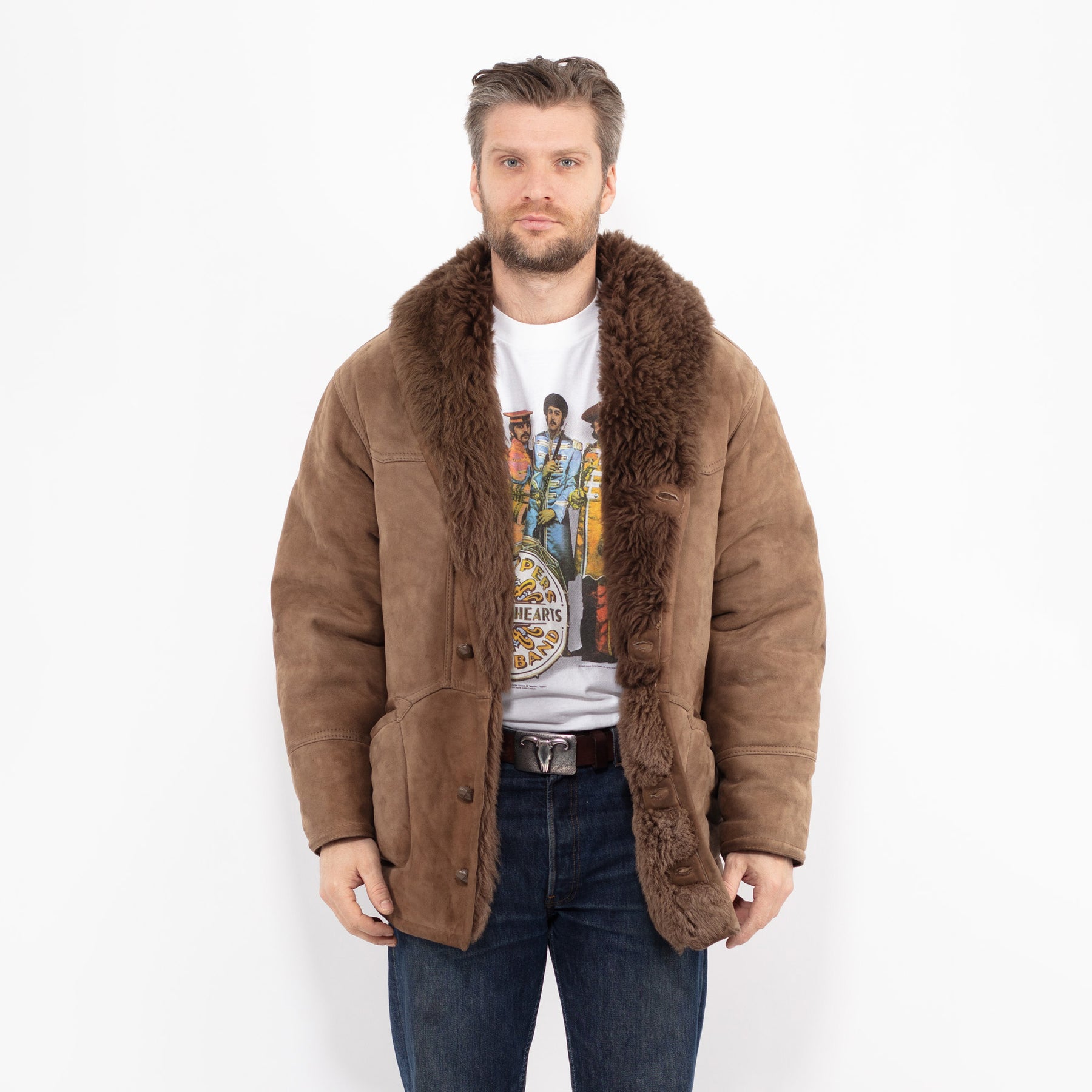 Vintage 80's Men Sheepskin Shearling Coat in Brown