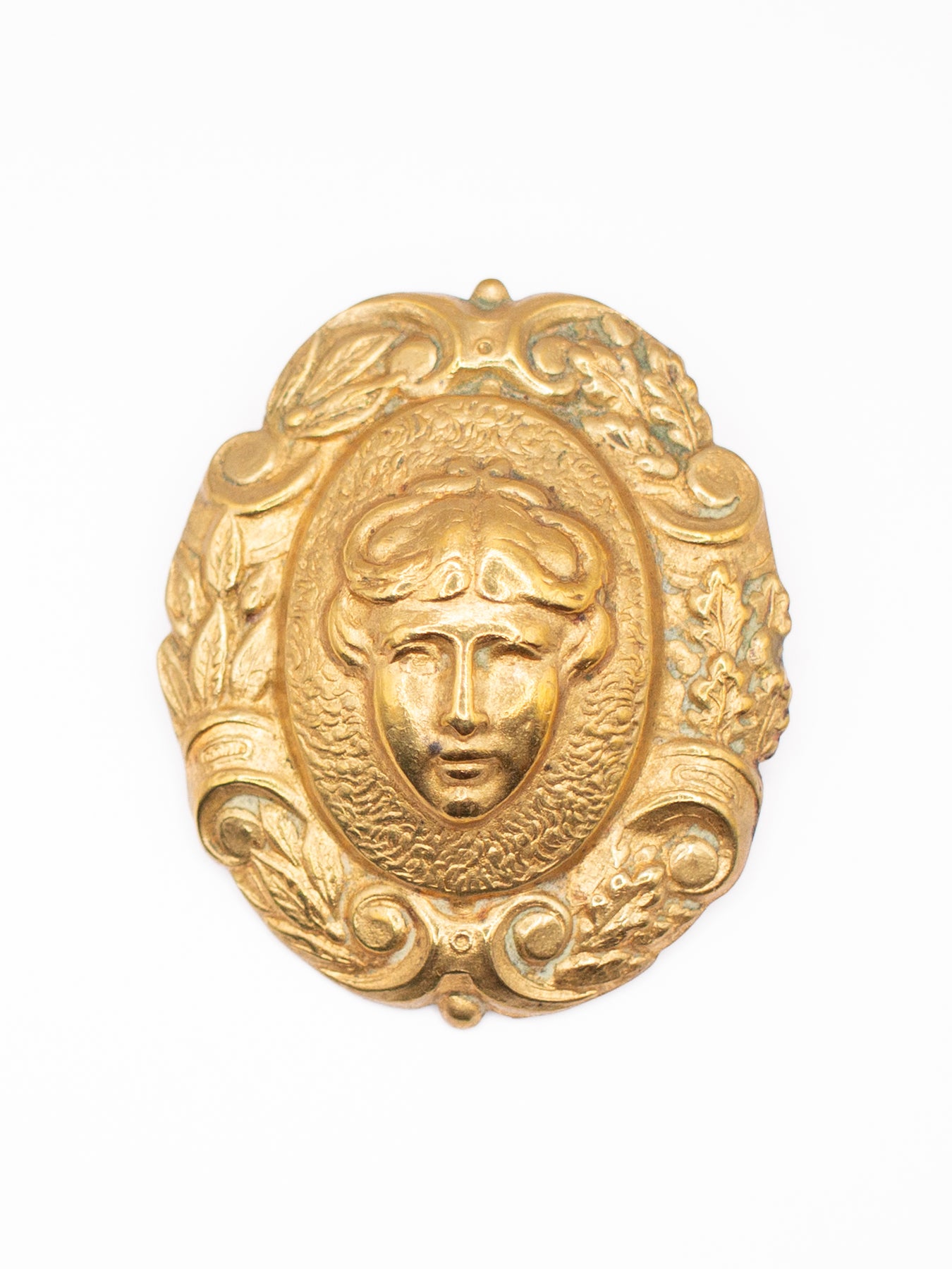 Vintage gold tone brooch featuring a classical female mask surrounded by ornate scroll and leaf motifs. Lightweight stamped metal design inspired by antique jewelry styles.