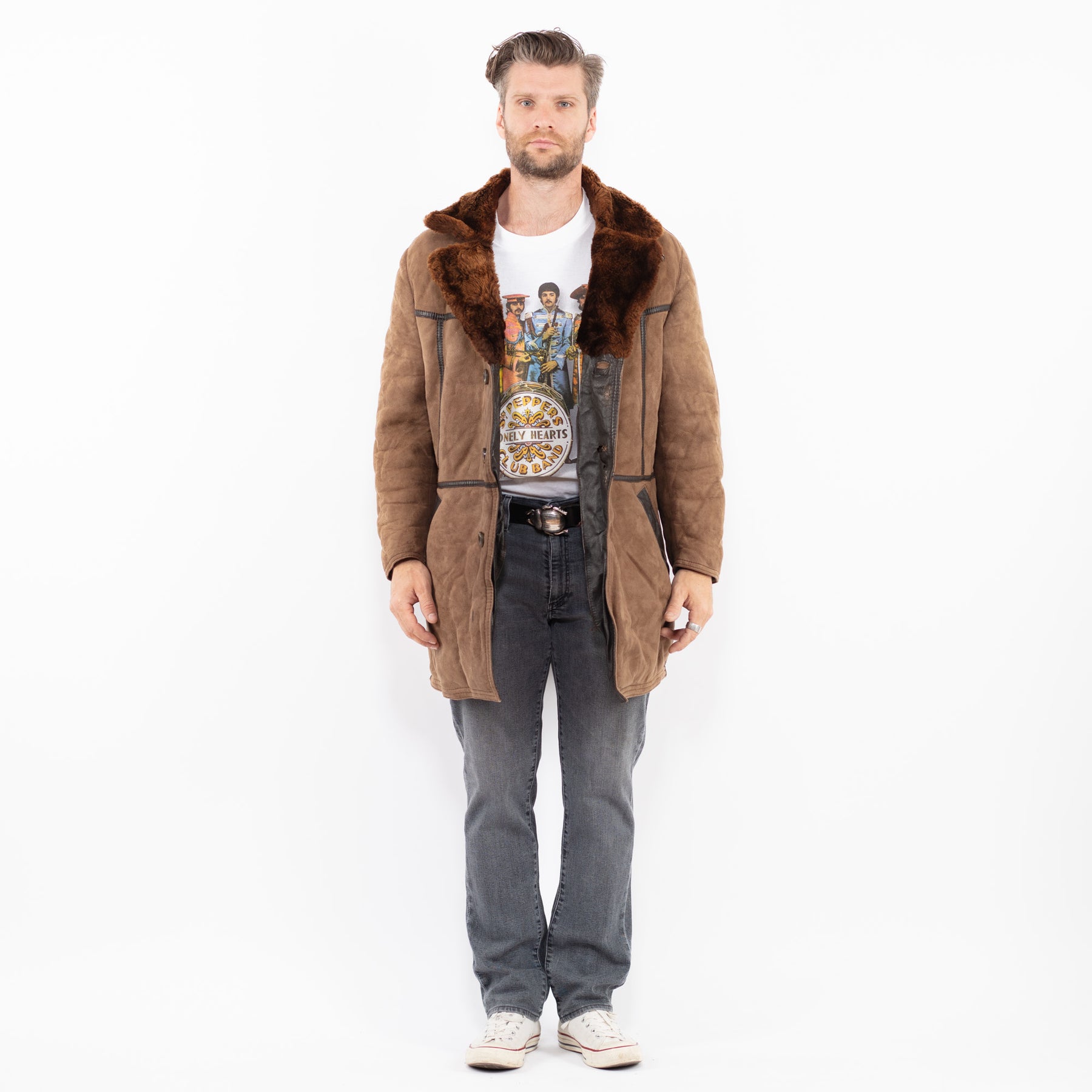 What it is: Vintage 70's Men Sheepskin Coat in Brown — genuine sheepskin (shearling), one-of-a-kind vintage.