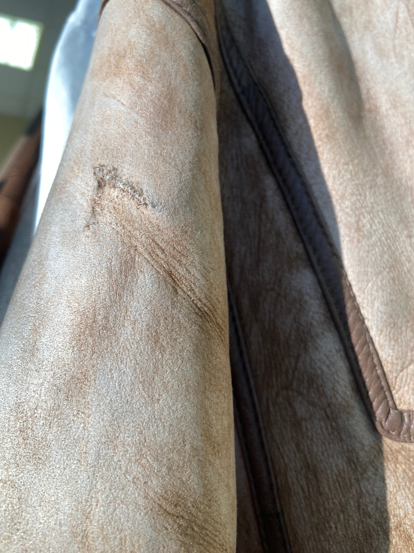 Vintage condition evaluation: 6/10 Shows wear, light creasing, surface bruising and some fading in high-touch areas, more so around the lower back and hemline. A mended spot on the upper right-hand sleeve shows hand stitching (see last photo)