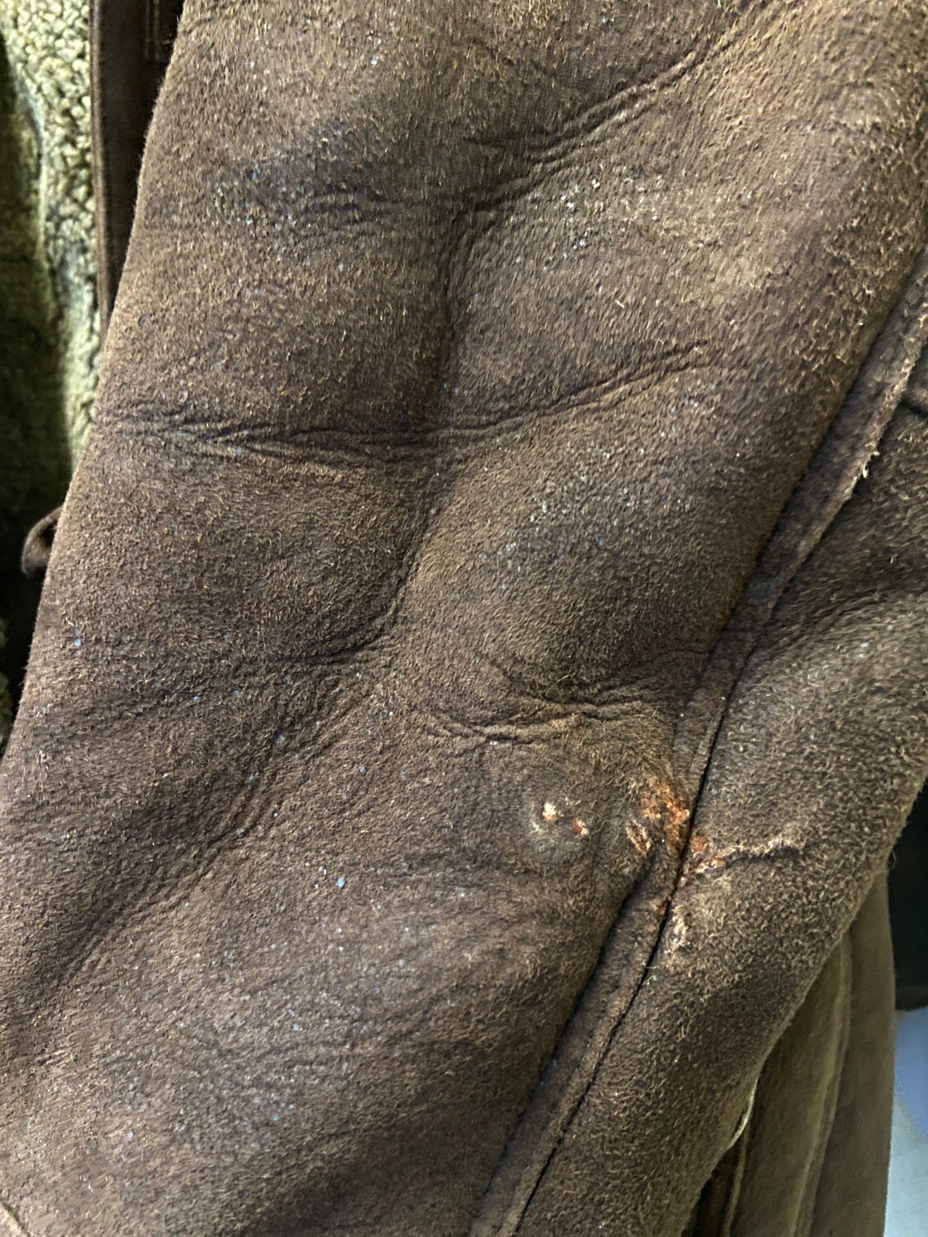 Vintage condition evaluation: 6.5/10 Showing some vintage wear consistent with age, natural fading, and light surface bruising to the suede; the damaged spot on the back of the left-hand sleeve has been mended as seen in the last photo
