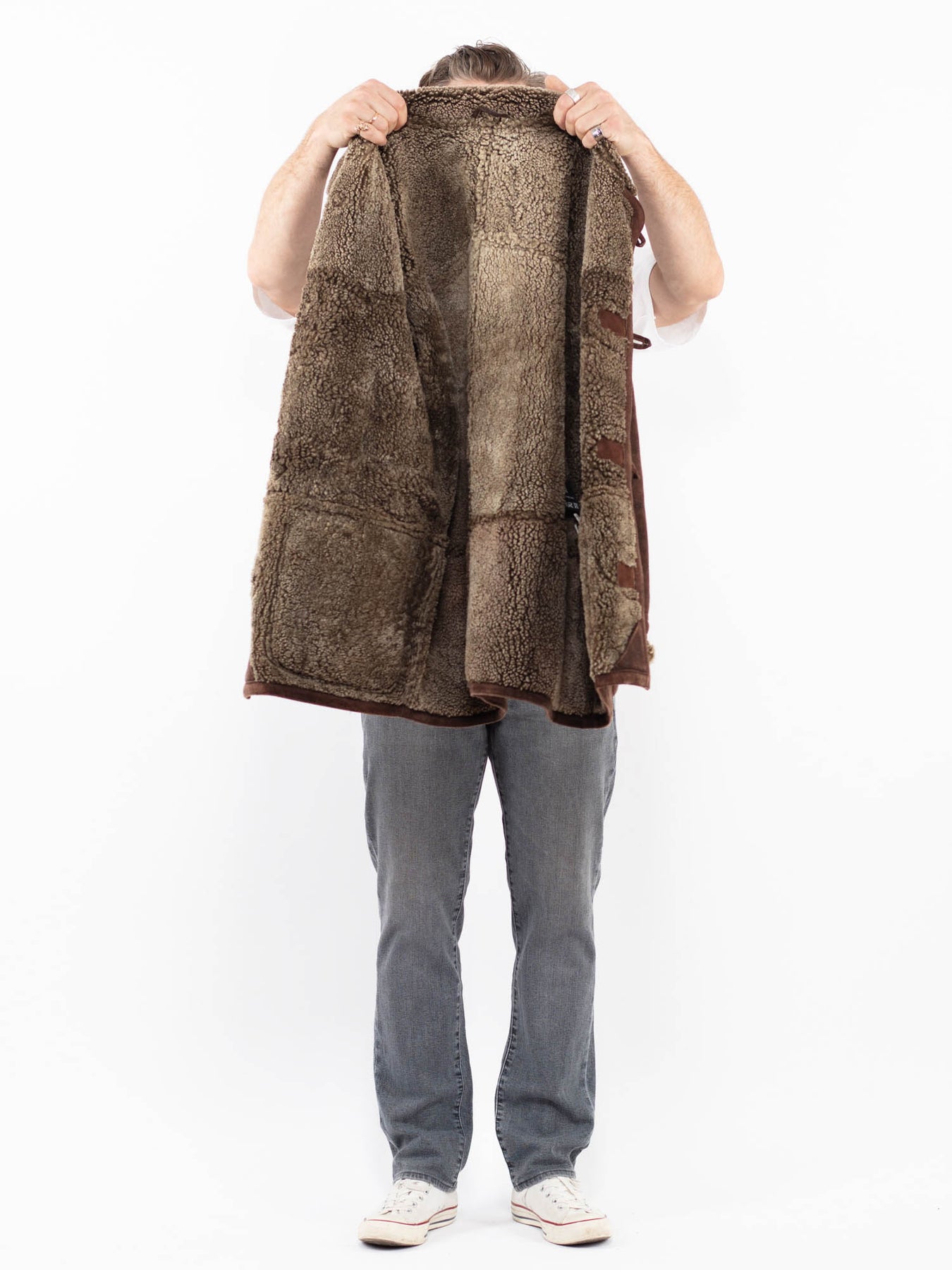 What it is: Vintage 80's Men Sheepskin Coat in Brown — genuine sheepskin (shearling), one-of-a-kind vintage.