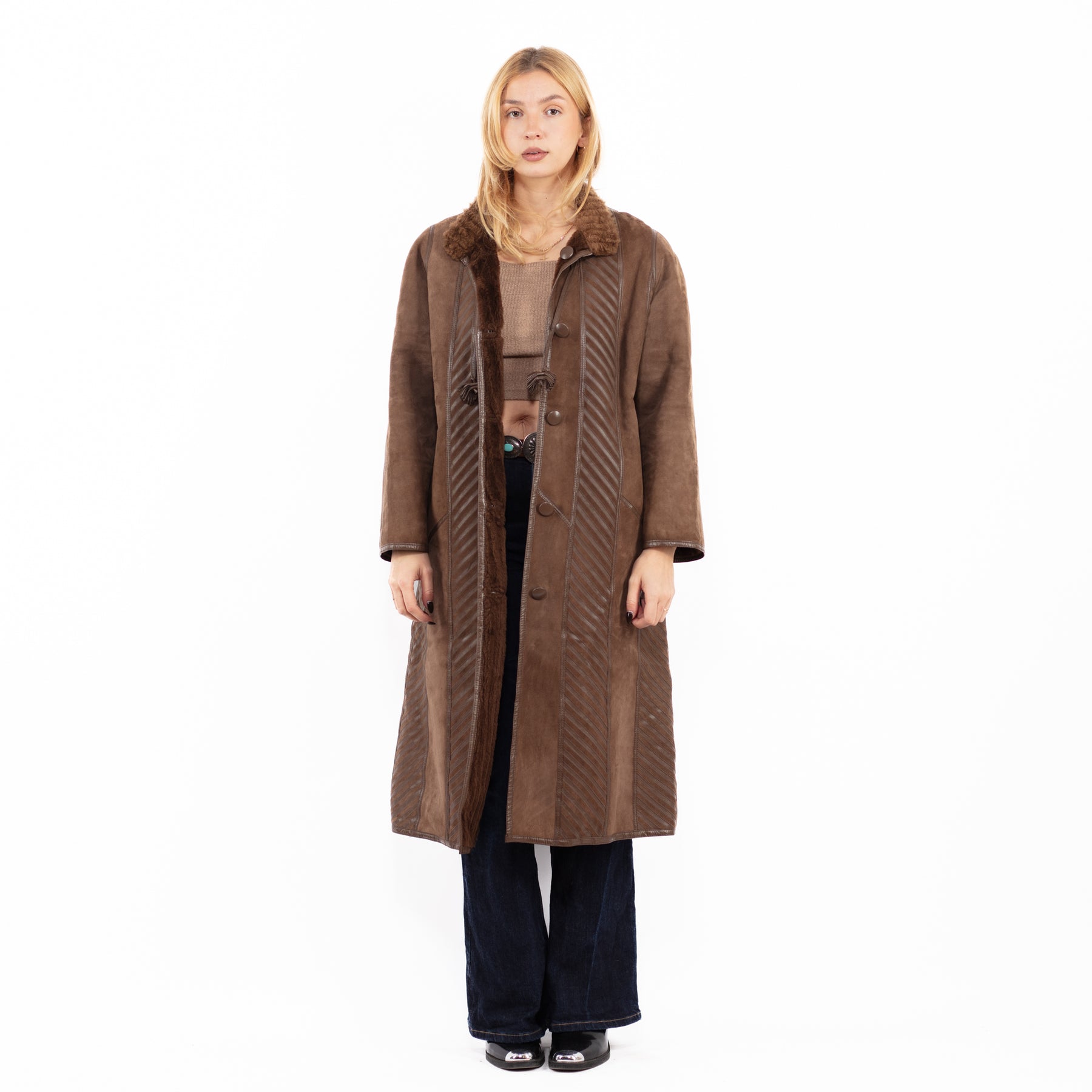 Brown Vintage 80's Women Reversible Sheepskin Long Coat in Brown With Free Delivery