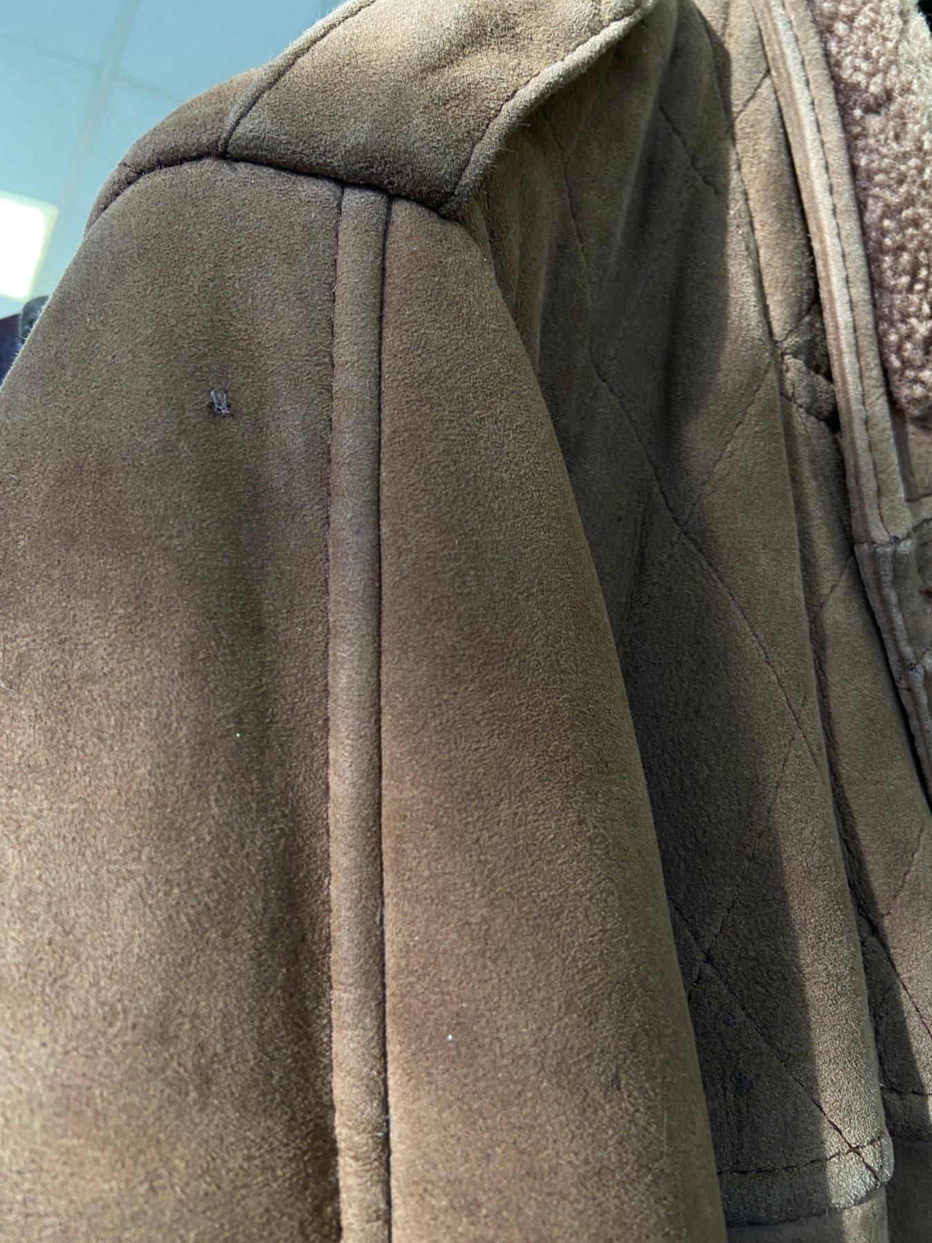 Vintage condition evaluation: 6/10 Showing age and wear, surface bruising and some darker discoloration around the edges and seam lines. Small mended spot on the right-hand shoulder shows hand stitching (see last photo)