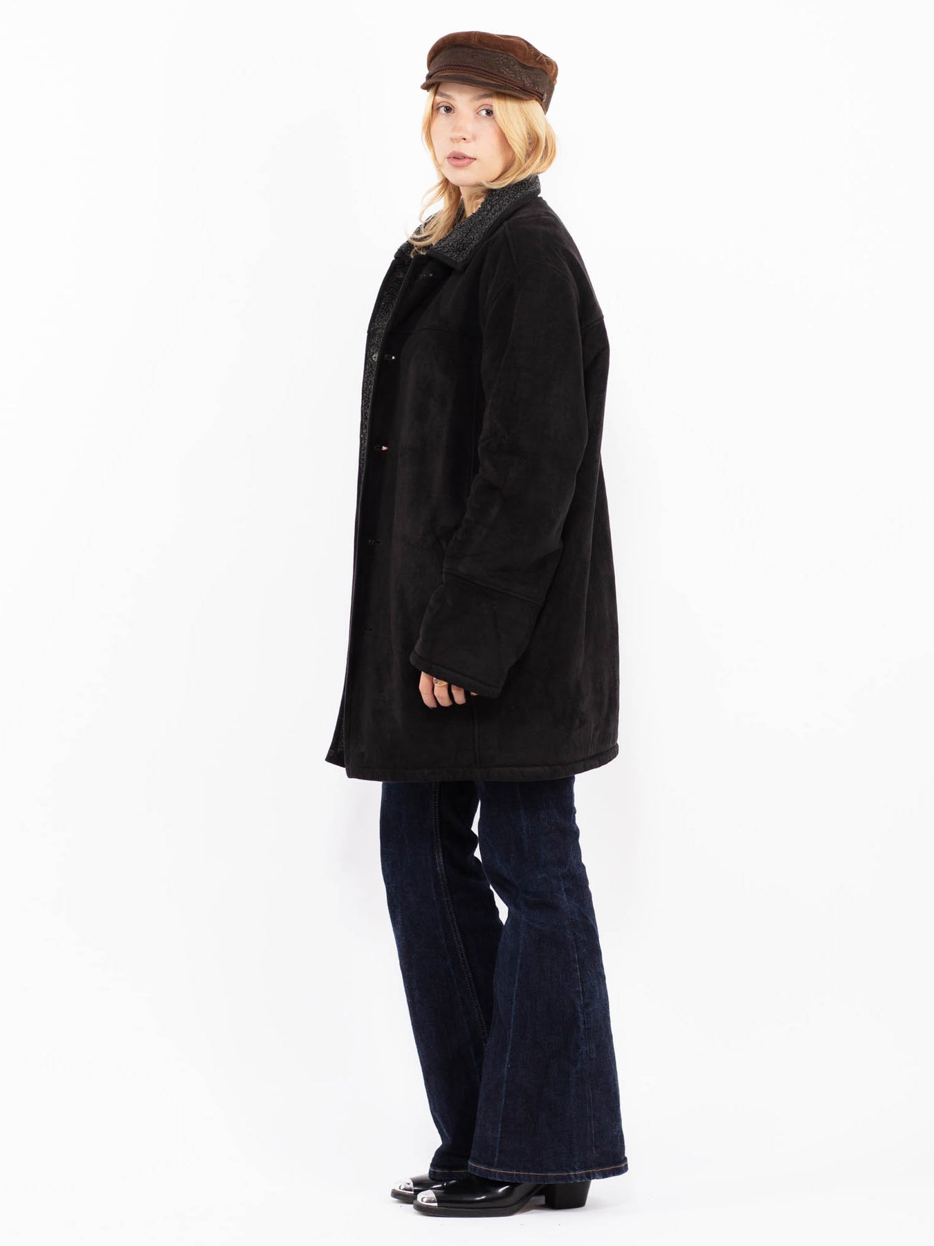 Vintage 90's Women Faux Sheepskin Coat in Black