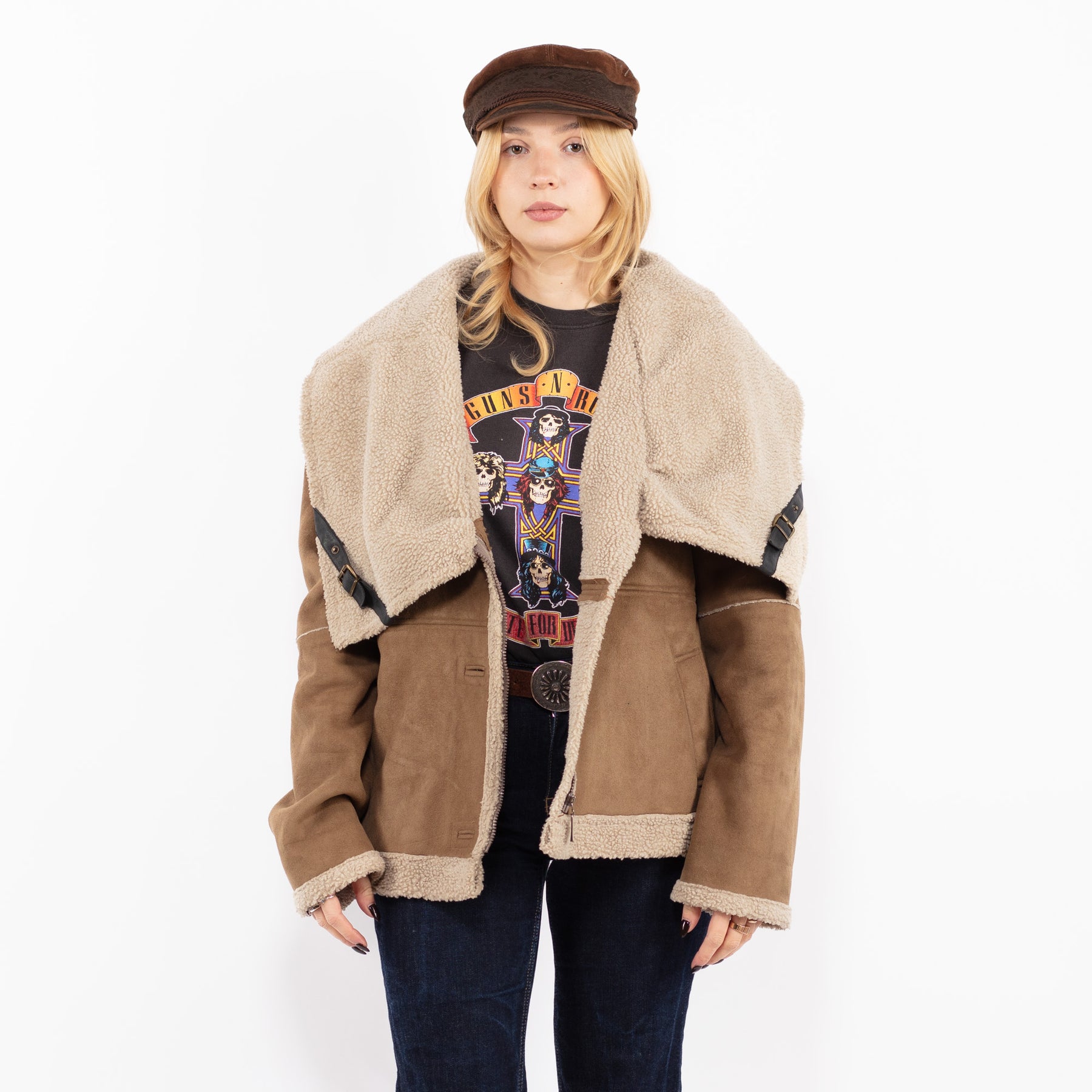 Beige Vintage 90's Women Faux Shepskin Bomber Jacket in Beige With Free Delivery