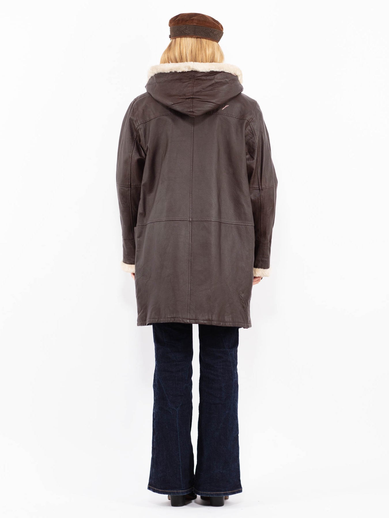 Vintage 90's Women Hooded Leather Sherpa Coat in Brown