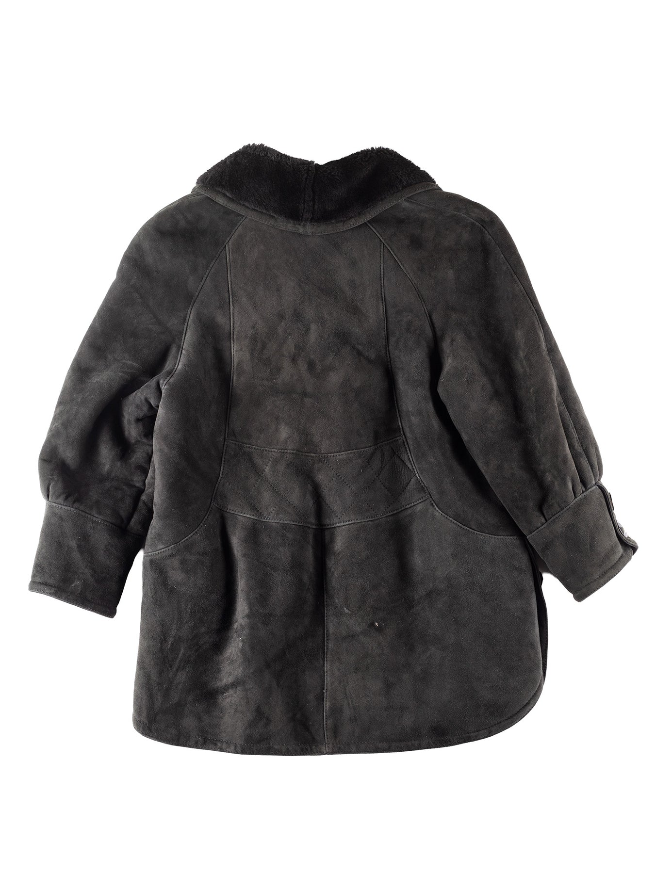 Vintage condition evaluation: 7/10 – visible wear with light marks and surface discoloration throughout. General patina to suede/leather. Fur collar remains in good condition.