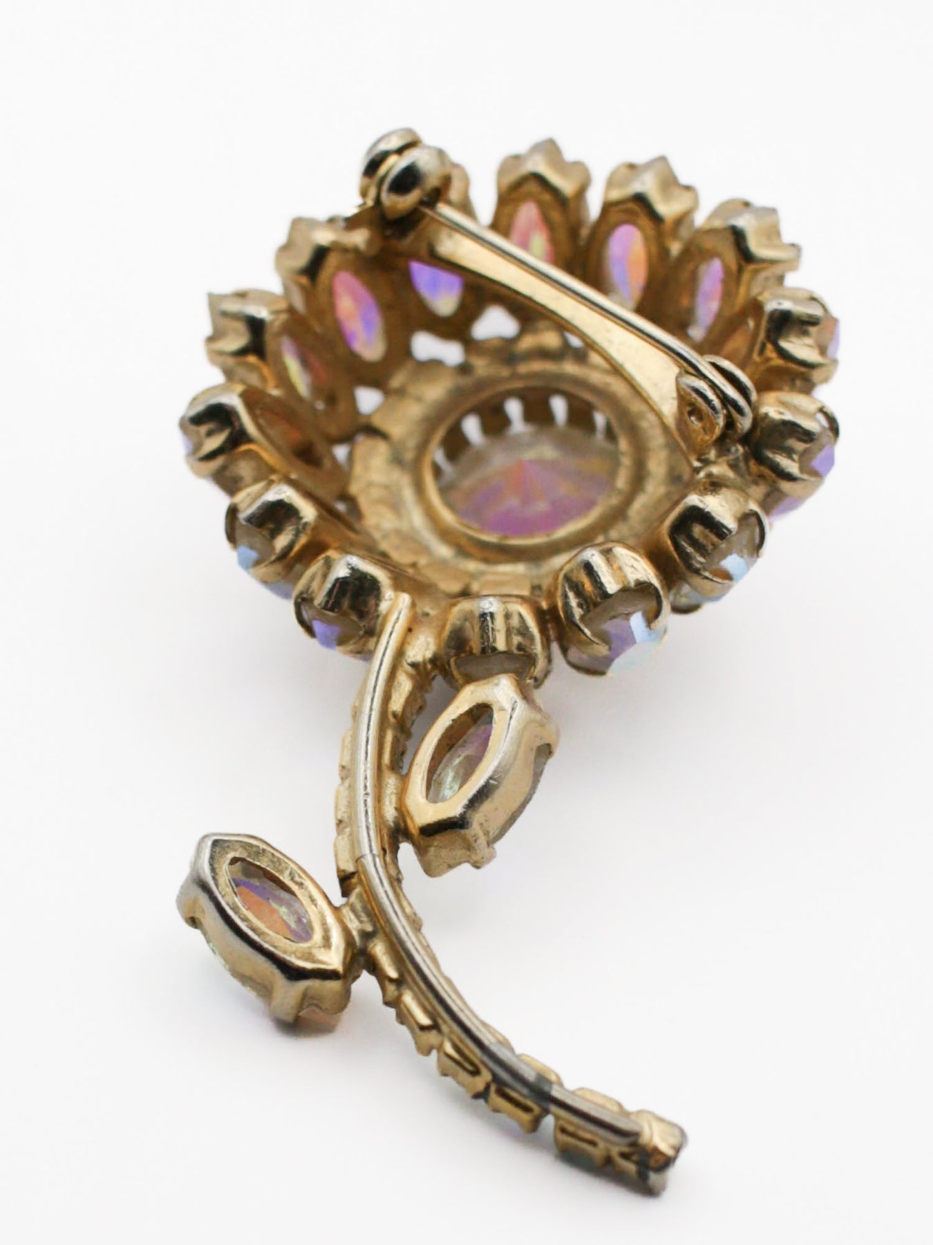 What it is: Kas tas ir: 1950s Aurora Borealis Rhinestone Flower Brooch – Vintage Iridescent Floral Pin