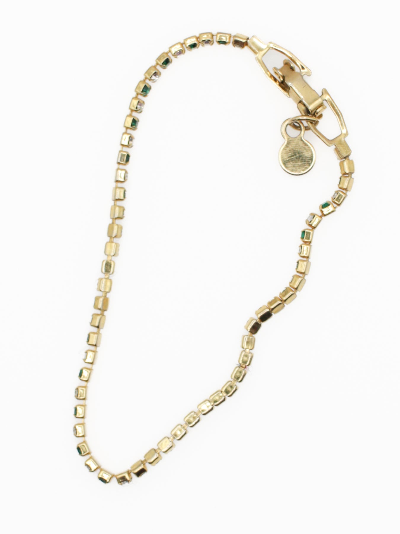 This is a vintage gold tone tennis bracelet set with alternating green and clear rhinestones. The slim, elegant line design gives it a classic mid century sparkle that works beautifully for both everyday wear and evening styling. A timeless piece with strong vintage character.