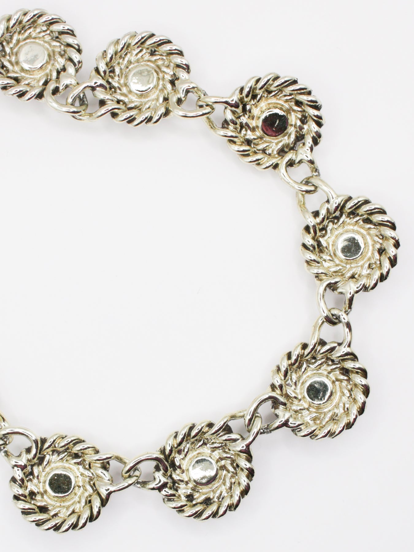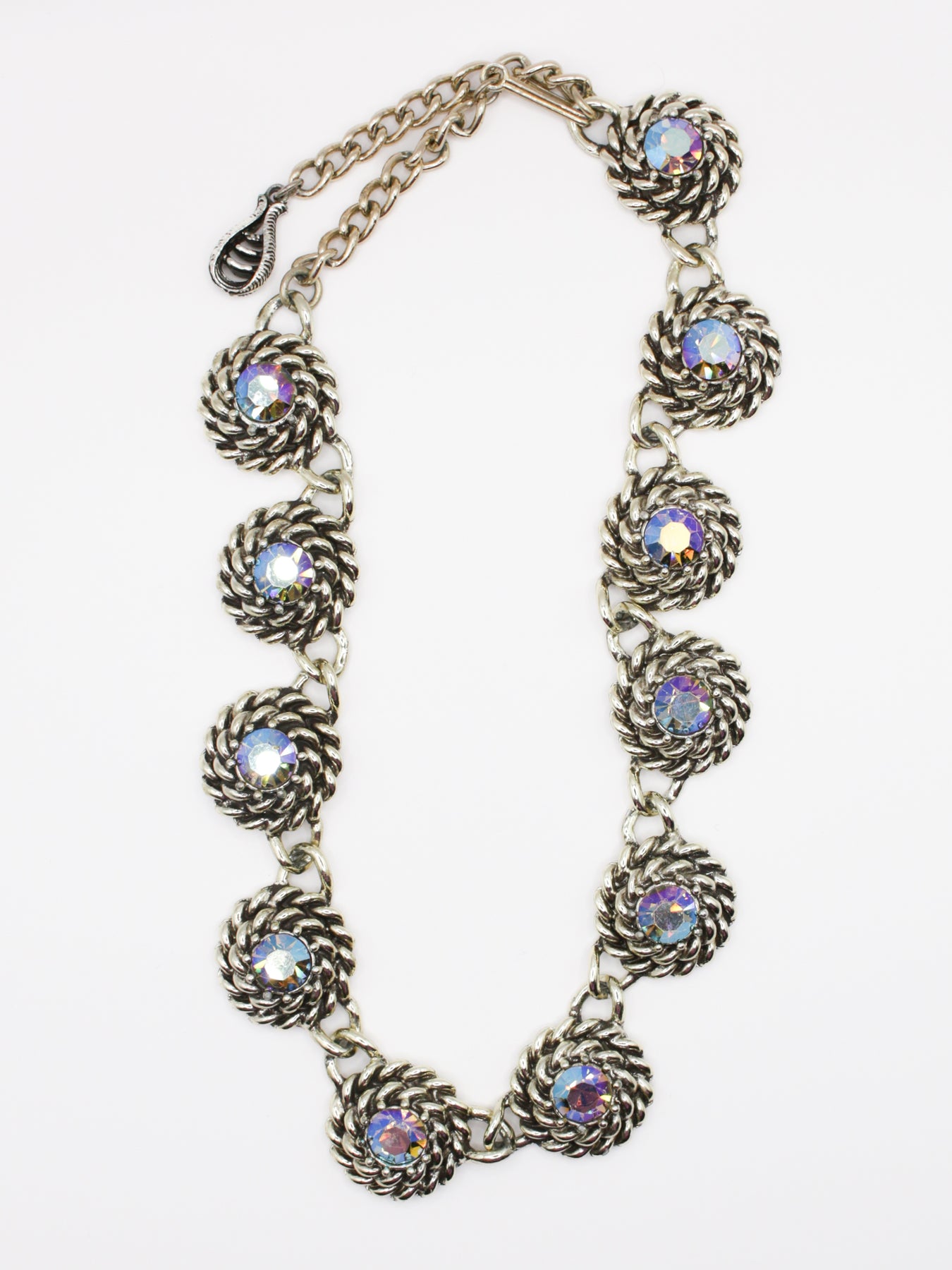 This is a vintage silver tone rope link necklace set with round aurora borealis crystals. The design features twisted rope style medallion links with shimmering rainbow stones that catch the light from every angle. A bold mid century statement necklace that adds sparkle to both daytime and evening looks.