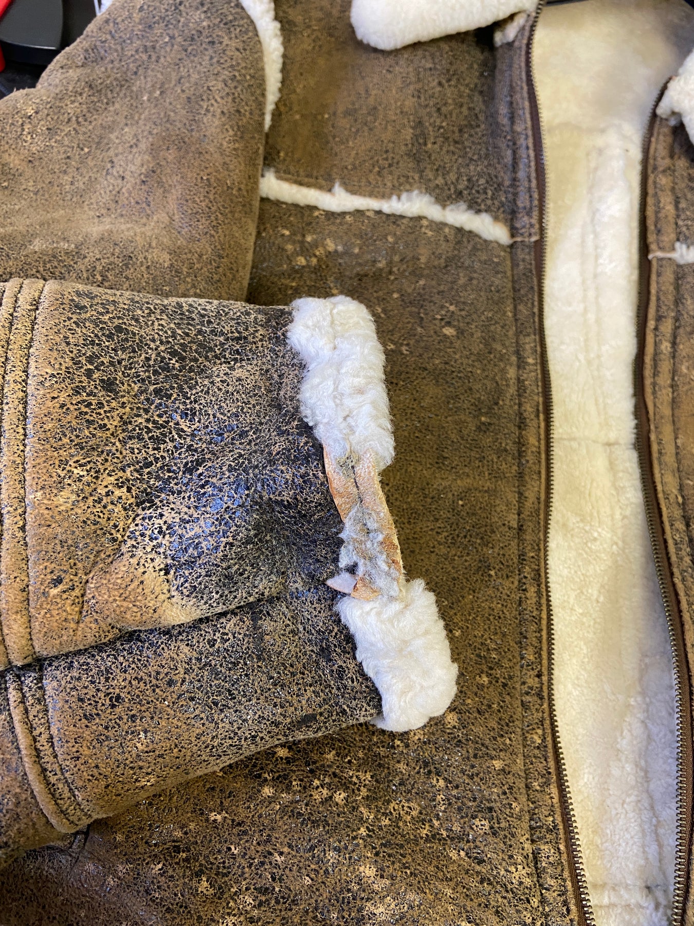 Vintage condition evaluation: 6/10 Shows surface bruising, scuffs, abrasions, and overall texture variation throughout giving it that rugged vintage look; there is a notable flaw on the right-hand cuff, where a section of the wool trim has rubbed off, as shown in the last photo. The shearling lining inside remains soft and intact