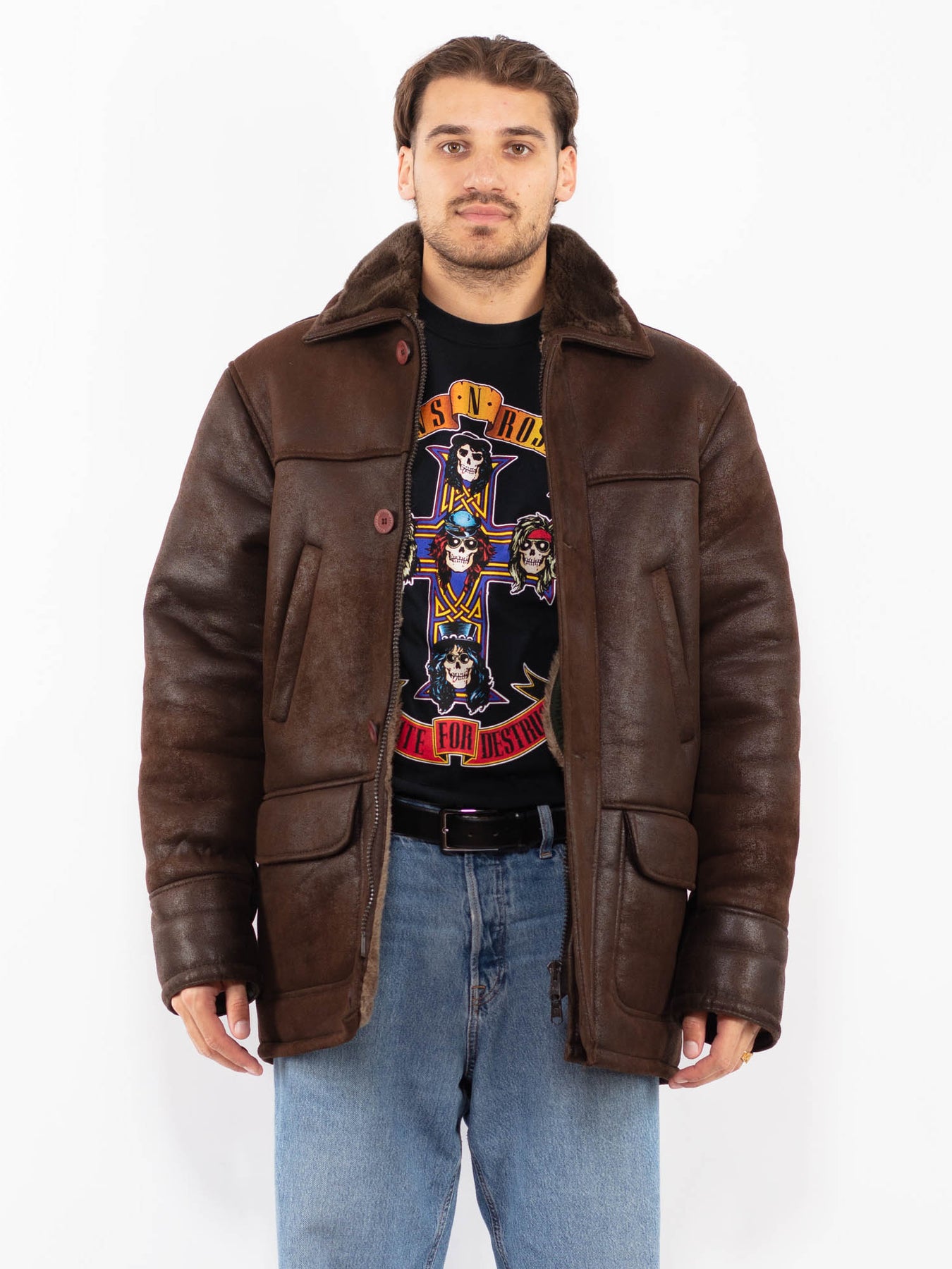 Vintage 90's Men Faux Sheepskin Coat in Dark Brown
