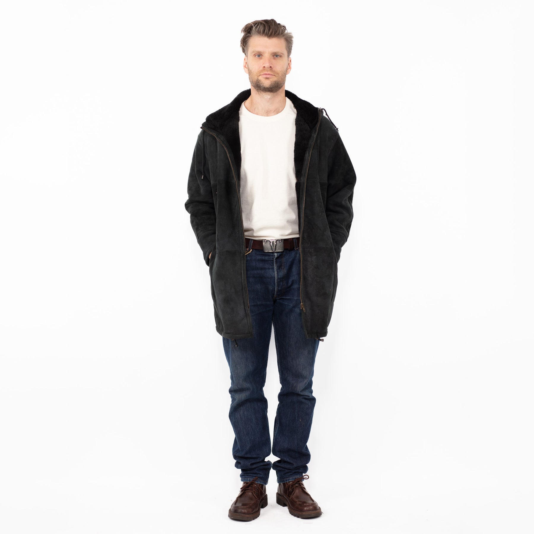 What it is: Vintage 90's Men Hooded Sheepskin Coat in Black — genuine sheepskin (shearling), one-of-a-kind vintage.