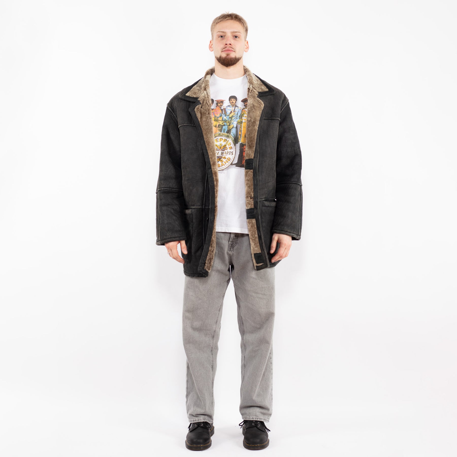 What it is: Vintage 90's Men Sheepskin Coat in Black — genuine sheepskin (shearling), one-of-a-kind vintage.