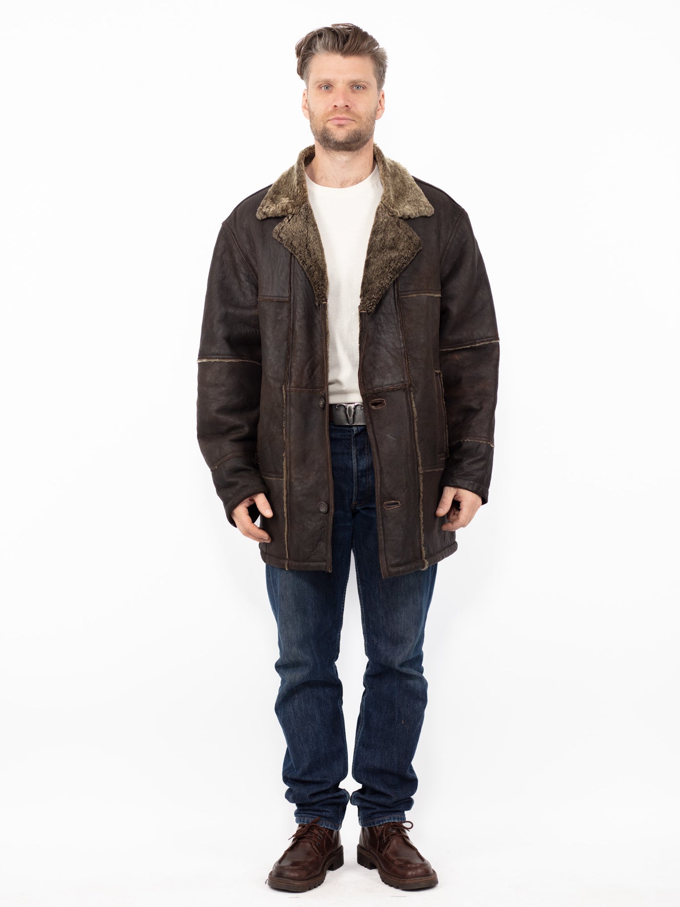 What it is: Vintage 90's Men Sheepskin Coat in Brown — genuine sheepskin (shearling), one-of-a-kind vintage.