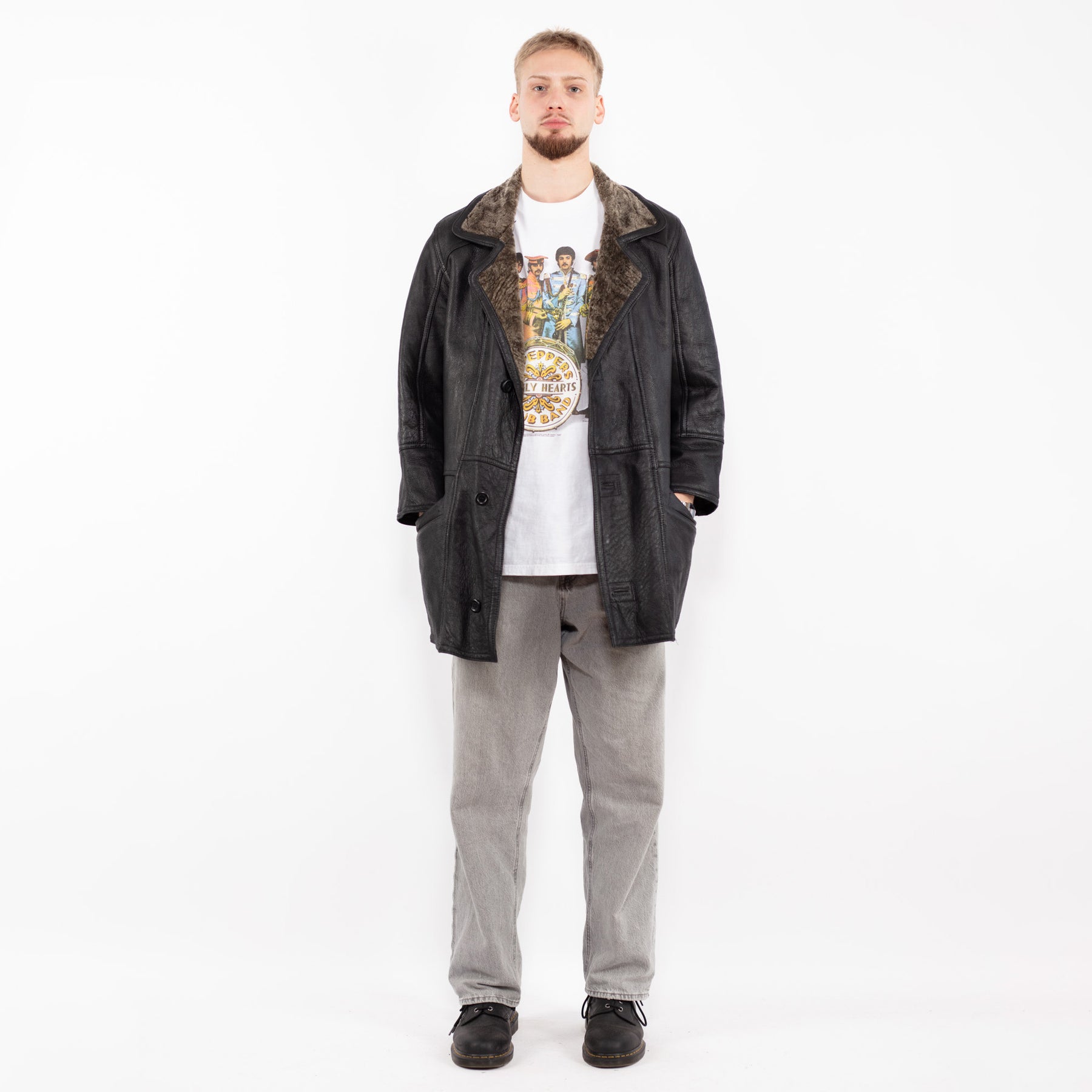 What it is: Vintage 90's Men Sheepskin Leather Coat in Black — genuine sheepskin (shearling), one-of-a-kind vintage.