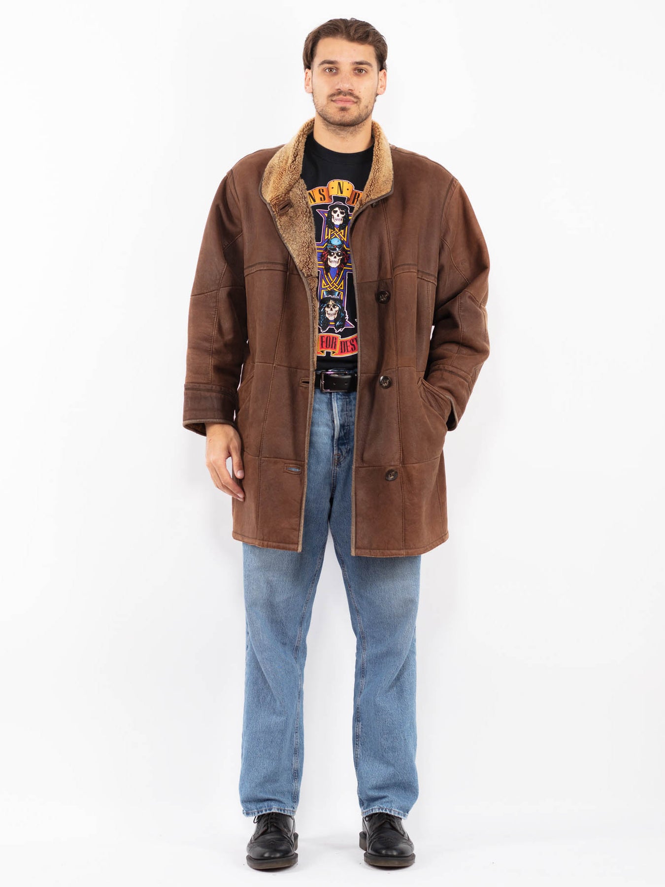 Vintage 90's Men Sheepskin Leather Coat in Brown