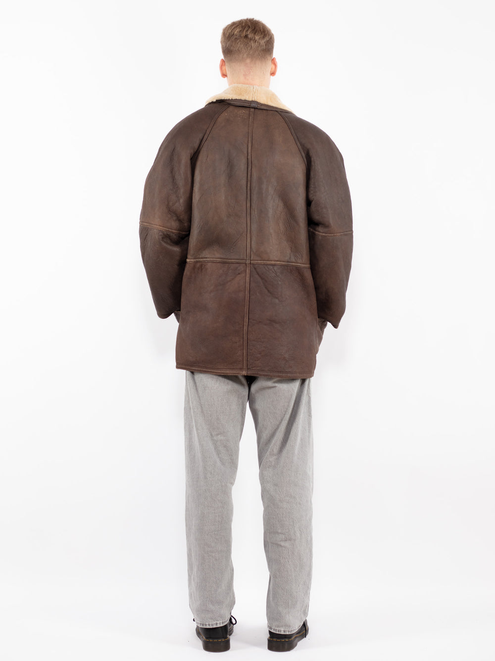 What it is: Vintage 90's Men Sheepskin Shearling Coat in Brown — genuine sheepskin (shearling), one-of-a-kind vintage.