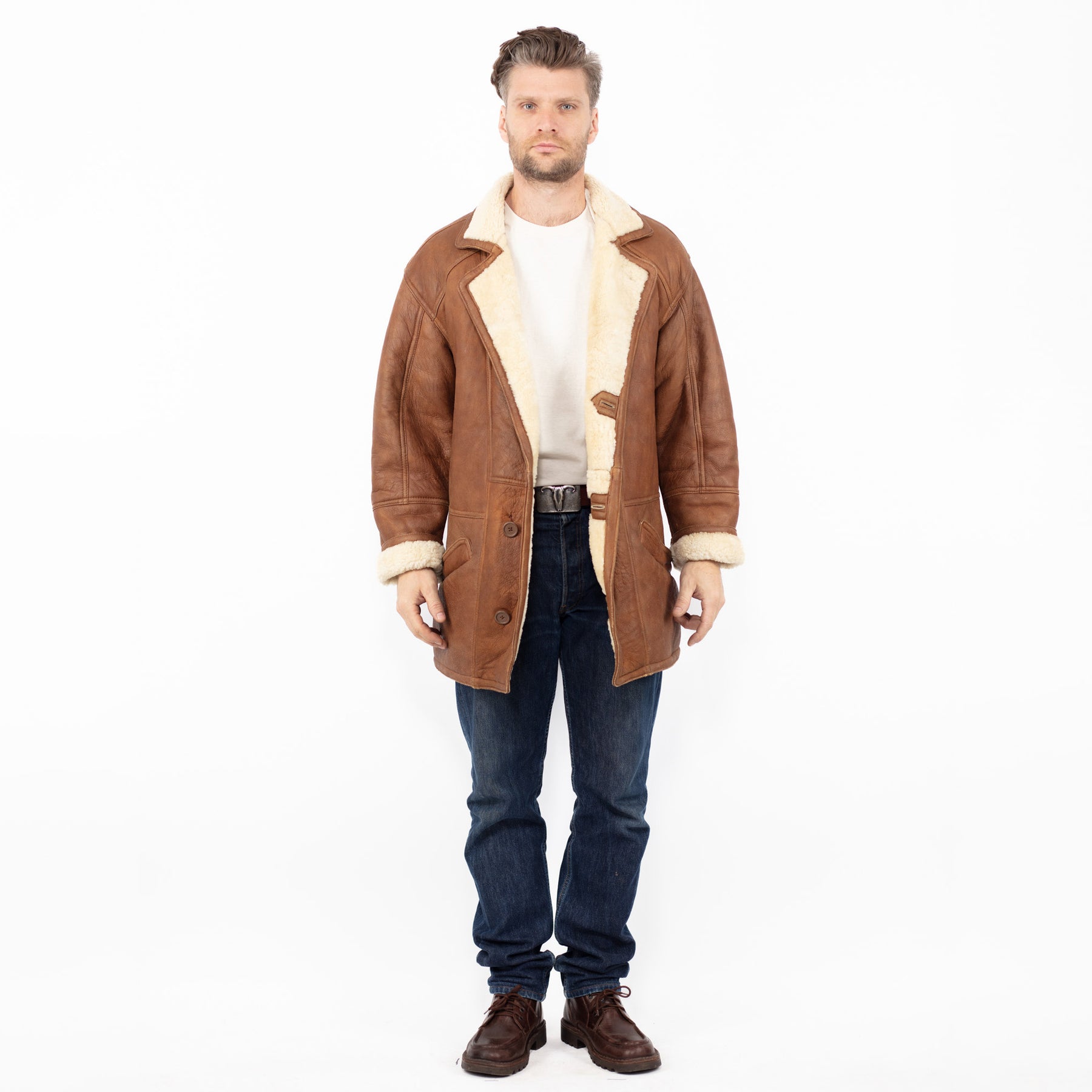 What it is: Vintage 90's Men Sheepskin Shearling Coat in Brown — genuine sheepskin (shearling), one-of-a-kind vintage.