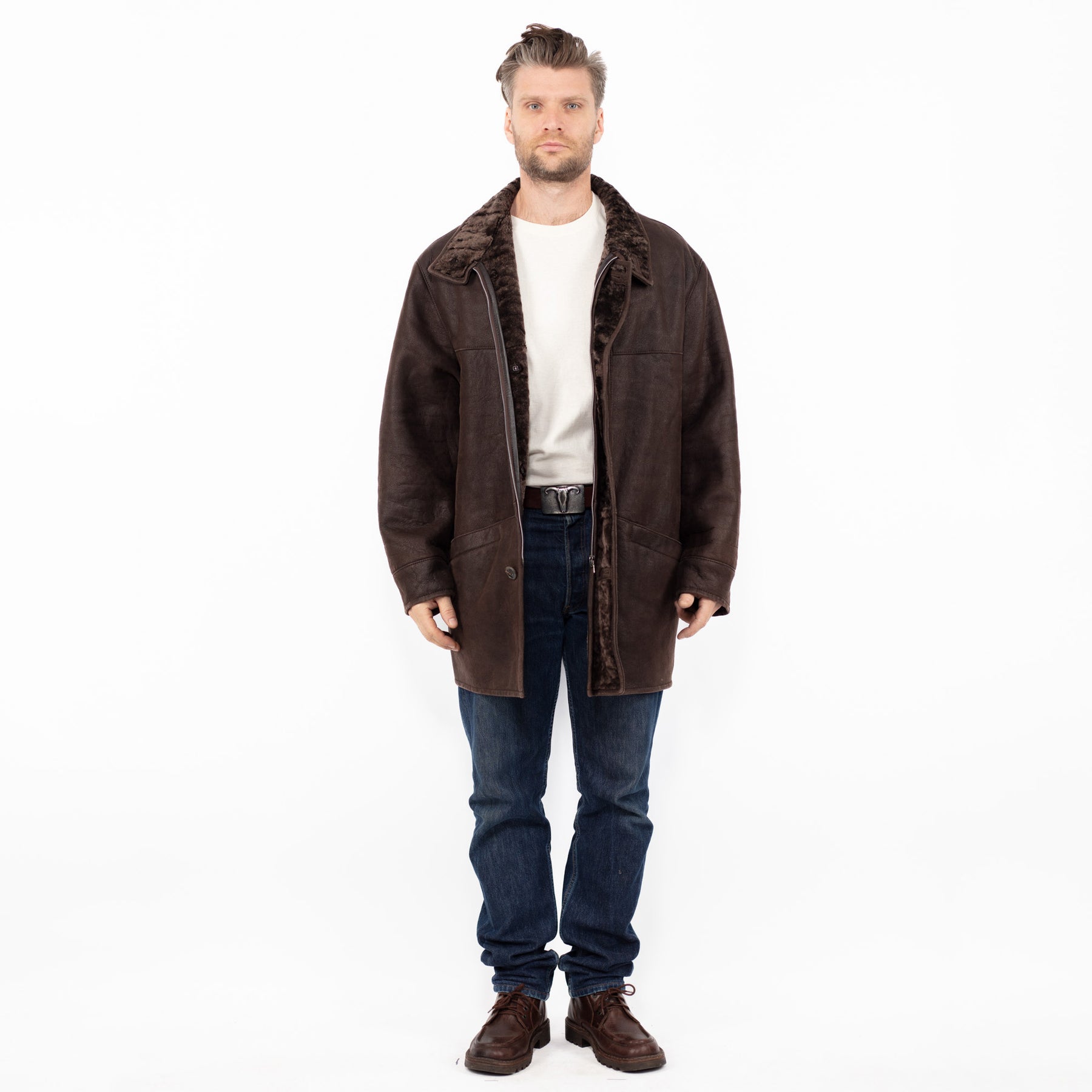 What it is: Vintage 90's Men Sheepskin Shearling Coat in Brown — genuine sheepskin (shearling), one-of-a-kind vintage.