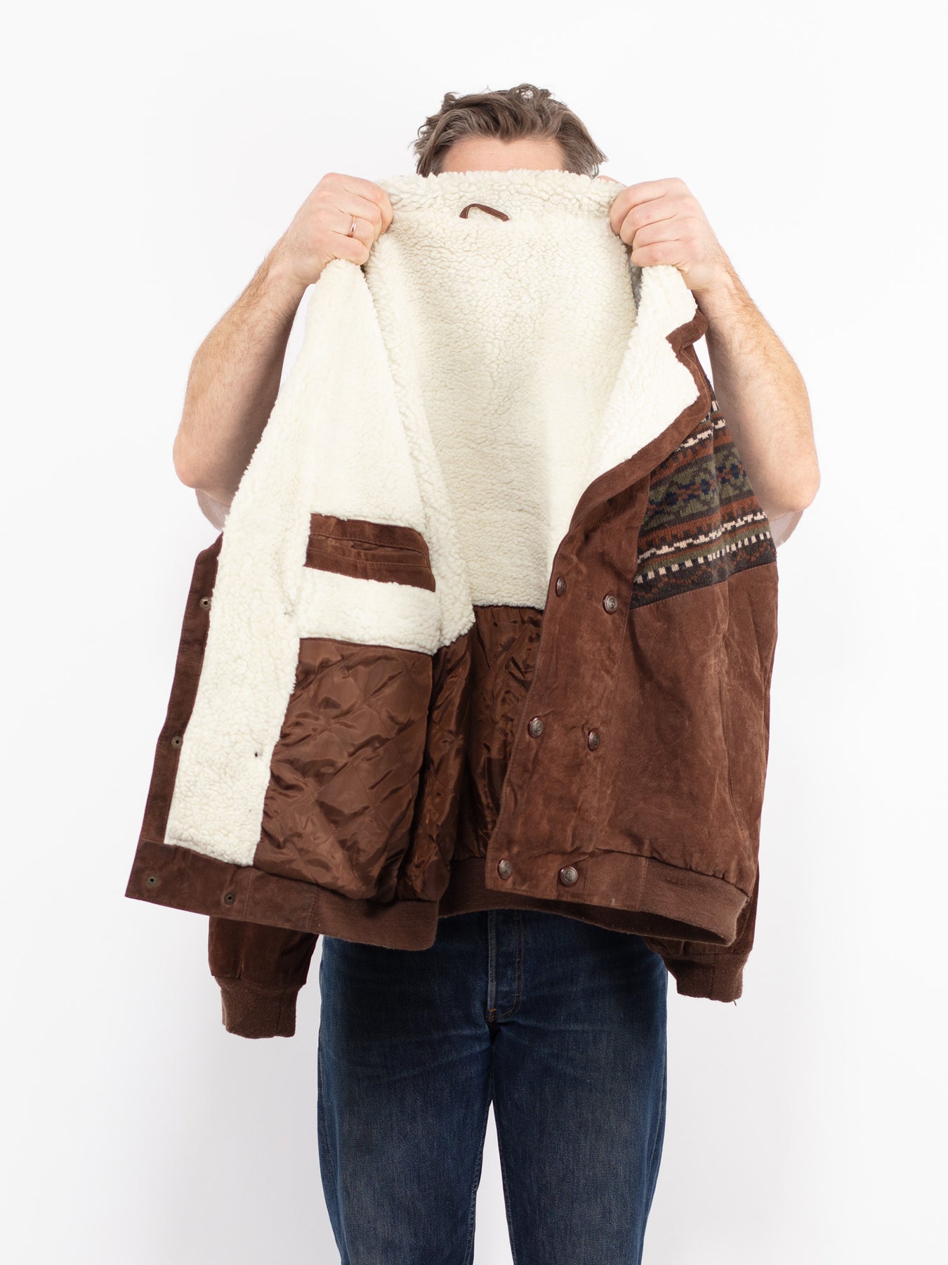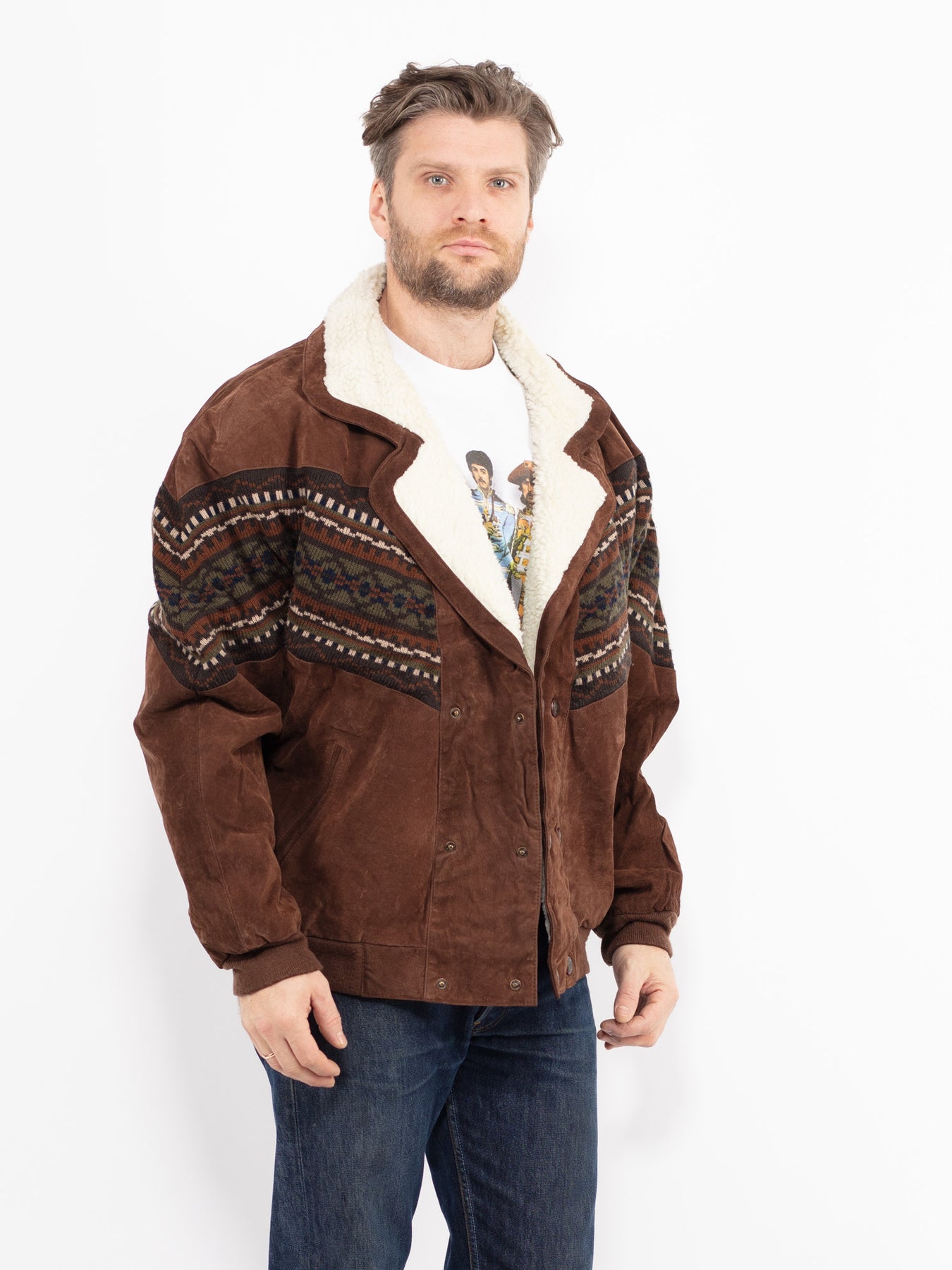 Brown Vintage 90's Men Aztec Suede Bomber Jacket in Brown Suede Sherpa With Free Delivery