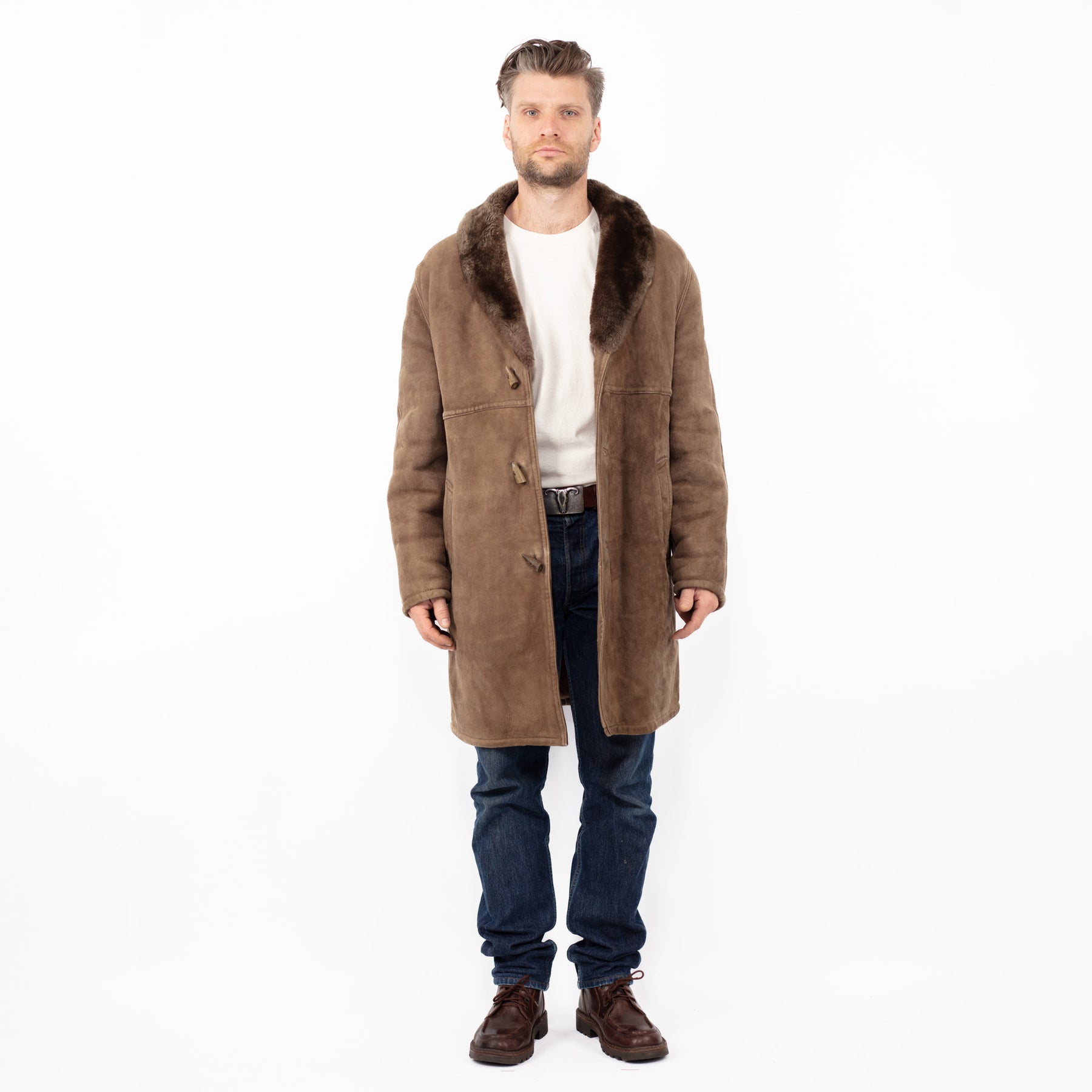 What it is: Vintage 70's Men Sheepskin Coat in Dark Beige — genuine sheepskin (shearling), one-of-a-kind vintage.