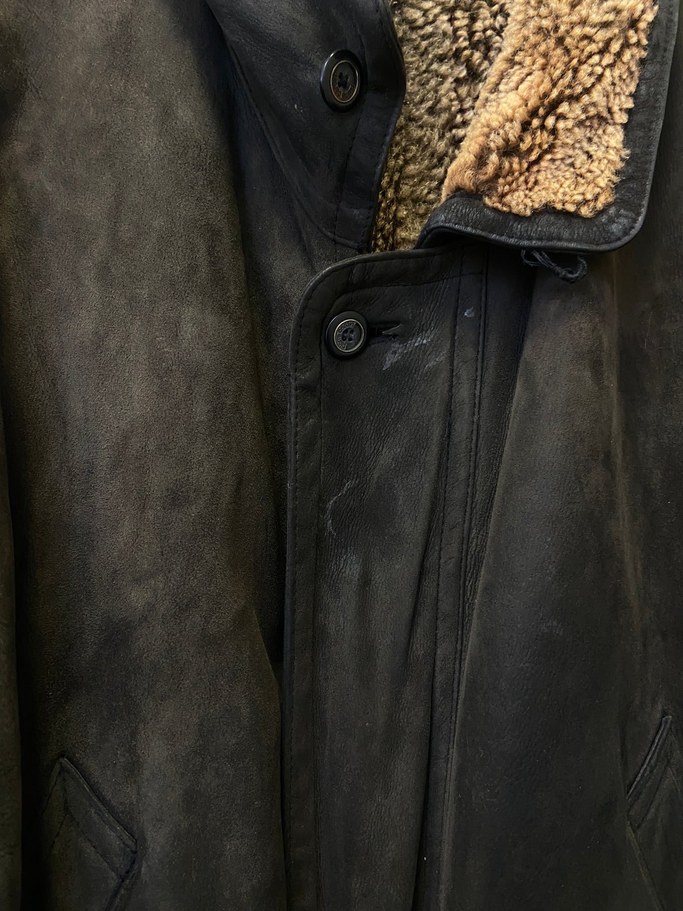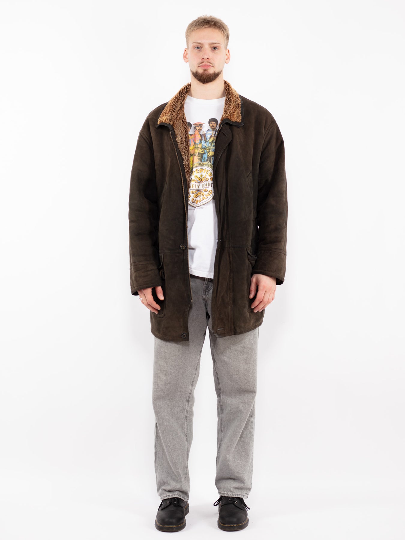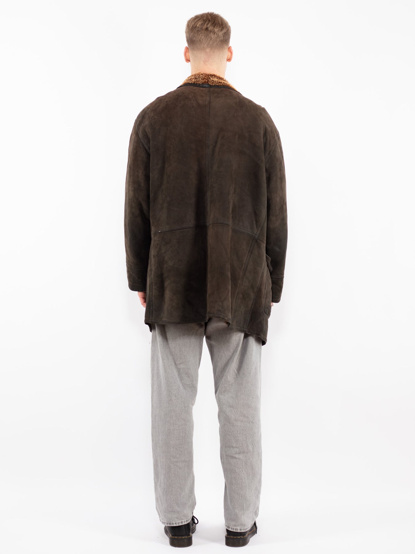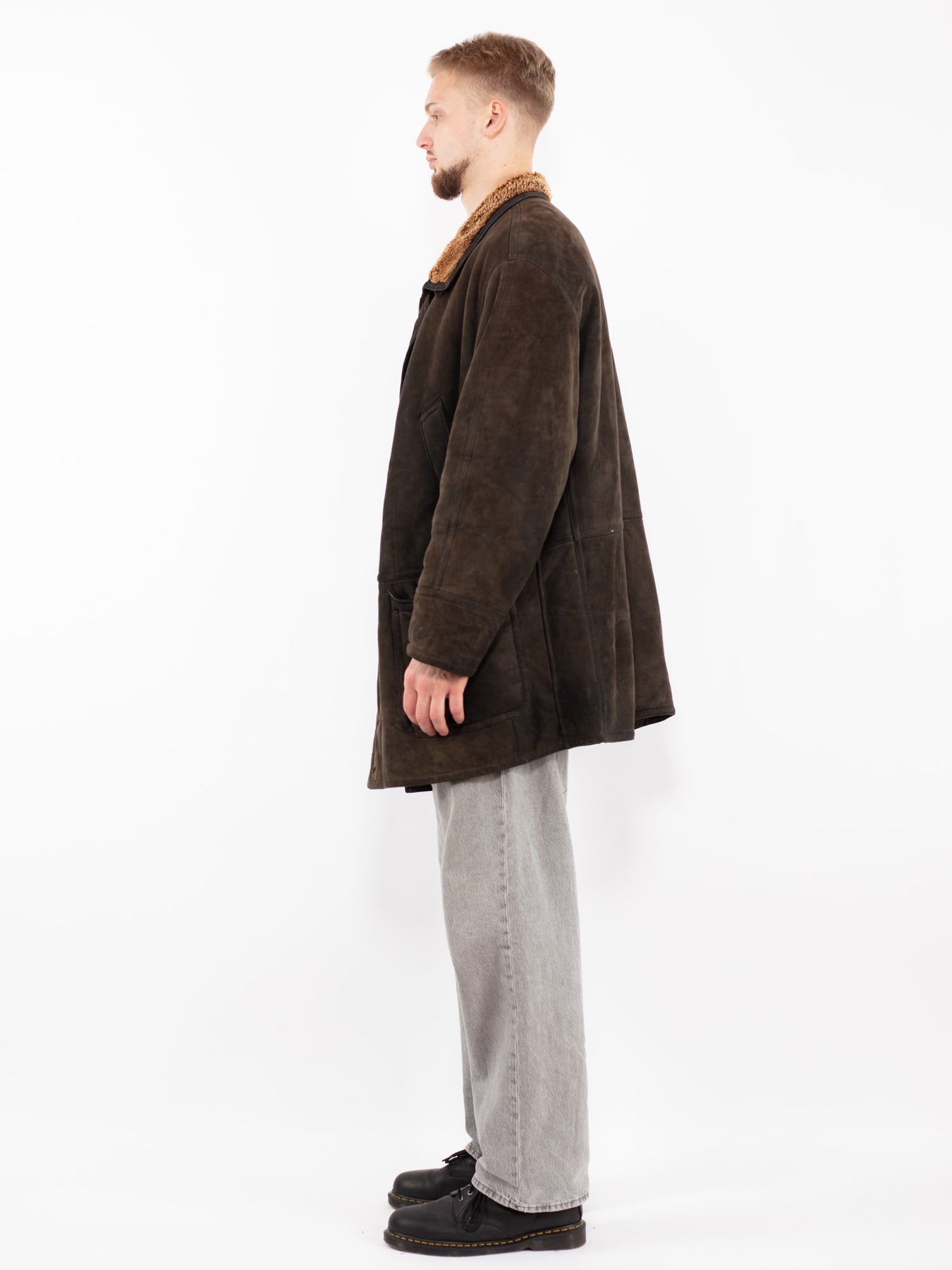 What it is: Vintage 90's Men Sheepskin Coat in Brown — genuine sheepskin (shearling), one-of-a-kind vintage.