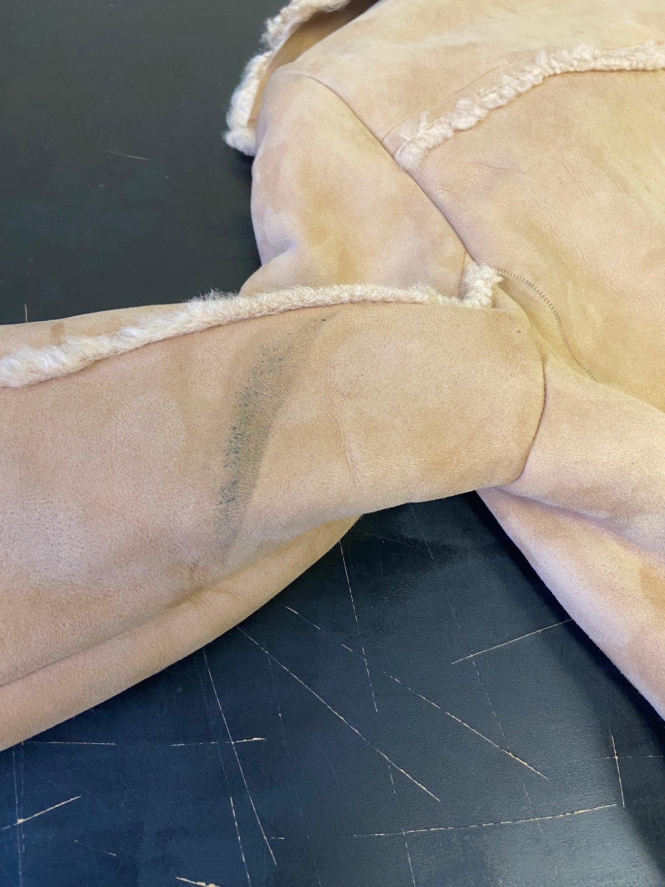 Vintage condition evaluation: 5/10 Shows wear, some creasing, and surface bruising with bit of overall darkening around the edges, more discoloration around the sleeves and a bigger stain on the left-hand underarm as seen in the last photo